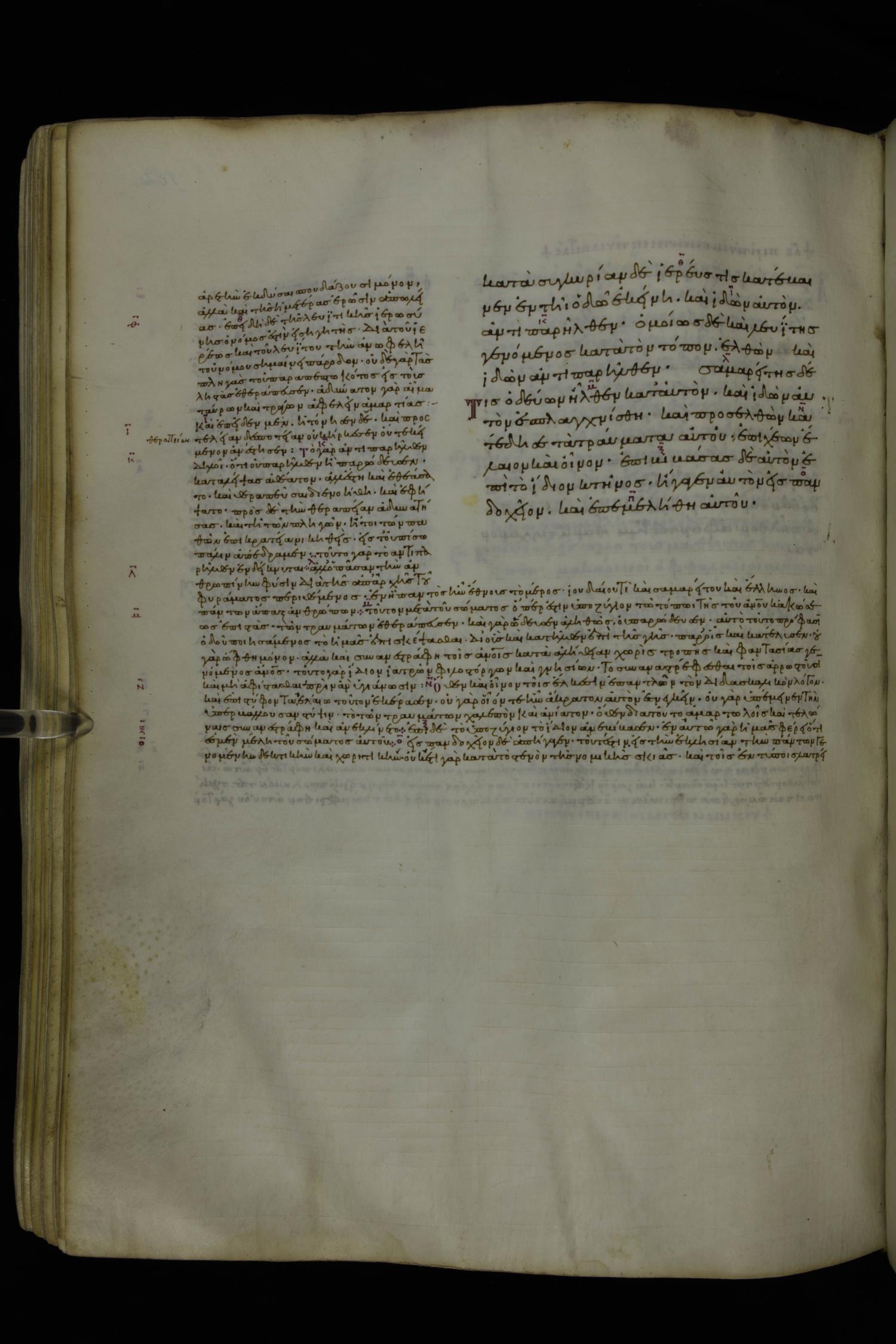 Tenth century minuscule of the Gospels with commentary; 285 leaves, 1 column, 4-34 lines per column. Images were taken at the National Library of Greece in Athens.