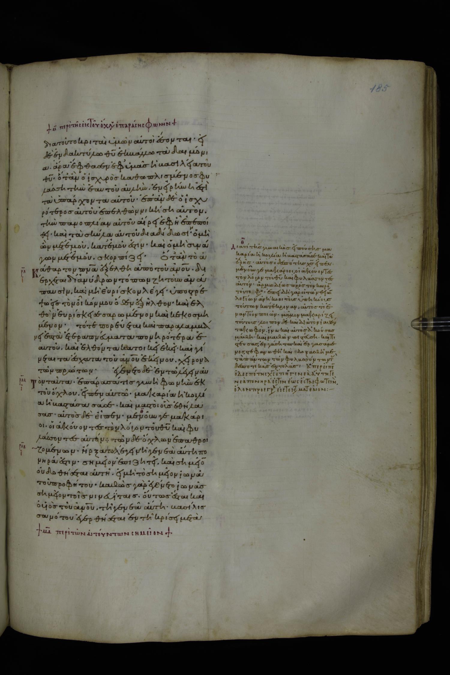 Tenth century minuscule of the Gospels with commentary; 285 leaves, 1 column, 4-34 lines per column. Images were taken at the National Library of Greece in Athens.