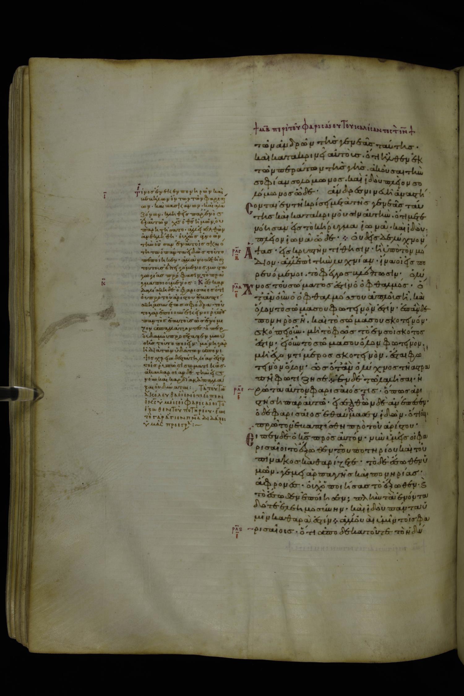 Tenth century minuscule of the Gospels with commentary; 285 leaves, 1 column, 4-34 lines per column. Images were taken at the National Library of Greece in Athens.