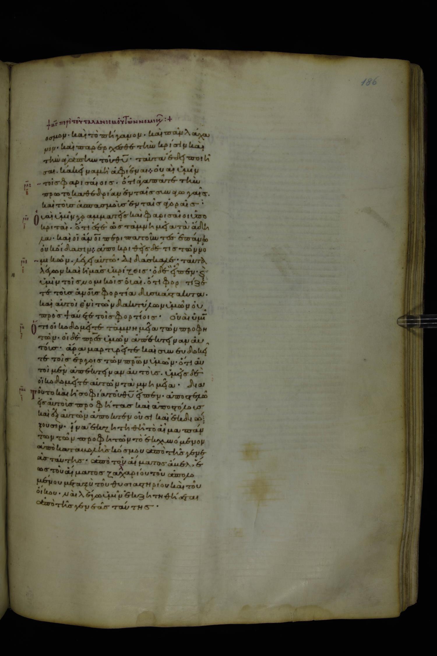 Tenth century minuscule of the Gospels with commentary; 285 leaves, 1 column, 4-34 lines per column. Images were taken at the National Library of Greece in Athens.