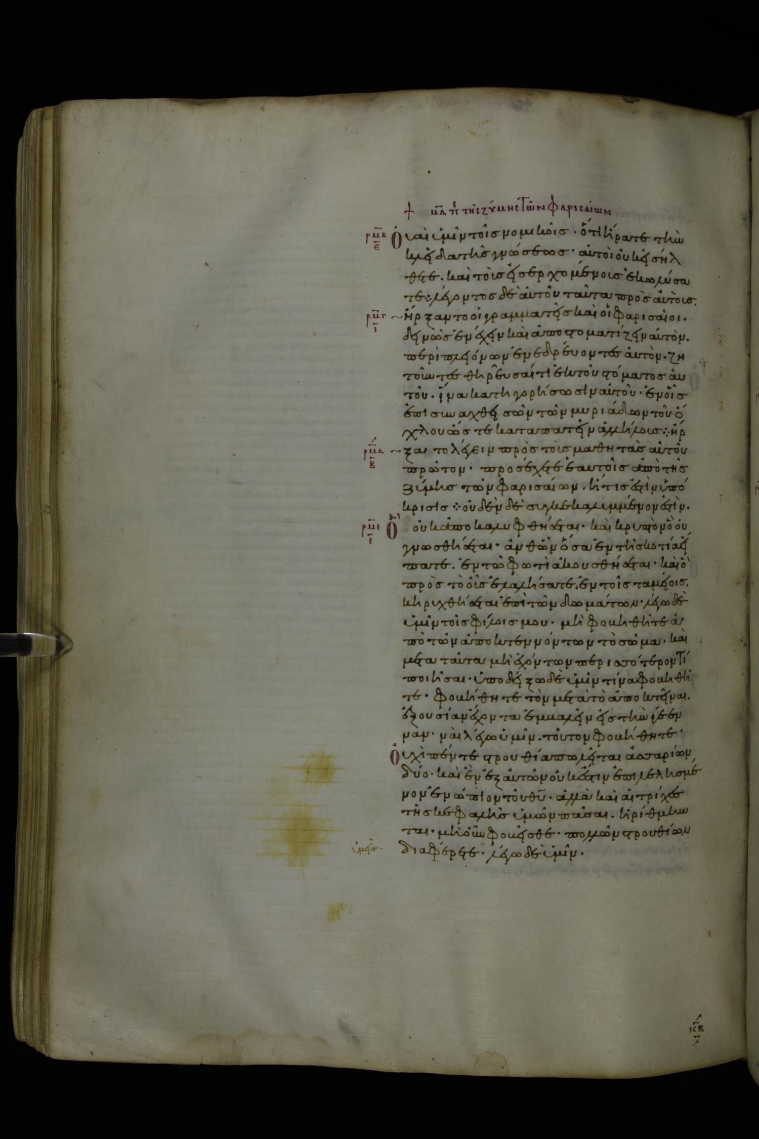 Tenth century minuscule of the Gospels with commentary; 285 leaves, 1 column, 4-34 lines per column. Images were taken at the National Library of Greece in Athens.