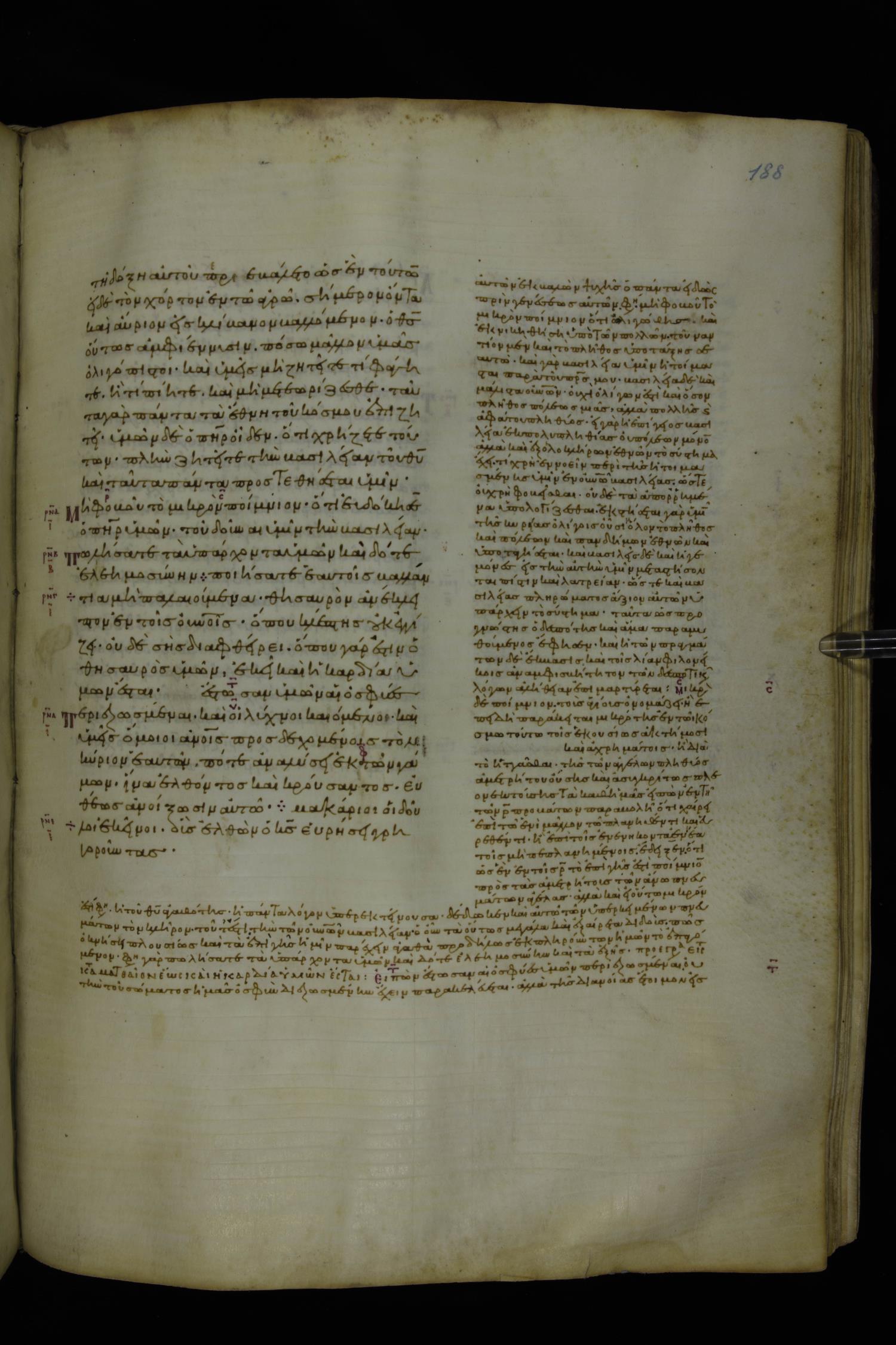 Tenth century minuscule of the Gospels with commentary; 285 leaves, 1 column, 4-34 lines per column. Images were taken at the National Library of Greece in Athens.