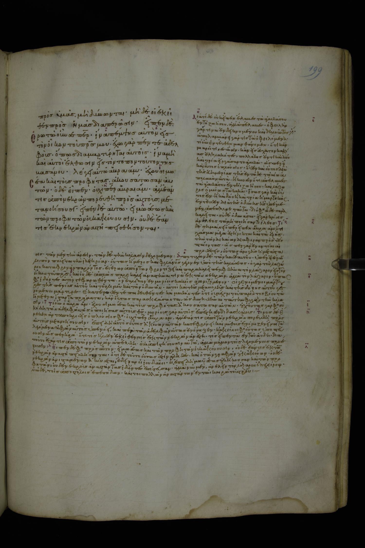 Tenth century minuscule of the Gospels with commentary; 285 leaves, 1 column, 4-34 lines per column. Images were taken at the National Library of Greece in Athens.