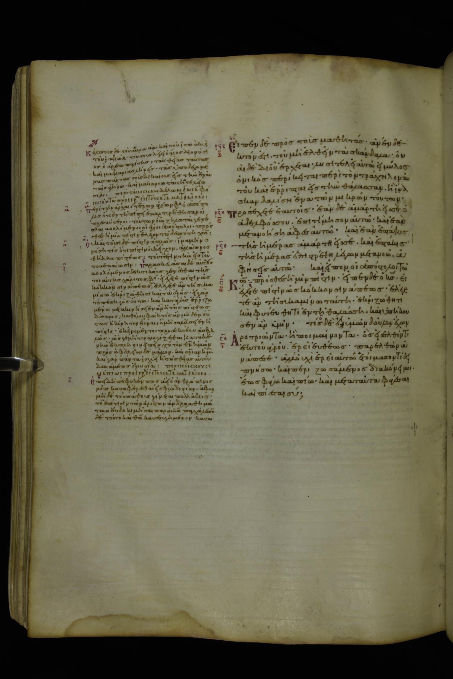 Tenth century minuscule of the Gospels with commentary; 285 leaves, 1 column, 4-34 lines per column. Images were taken at the National Library of Greece in Athens.
