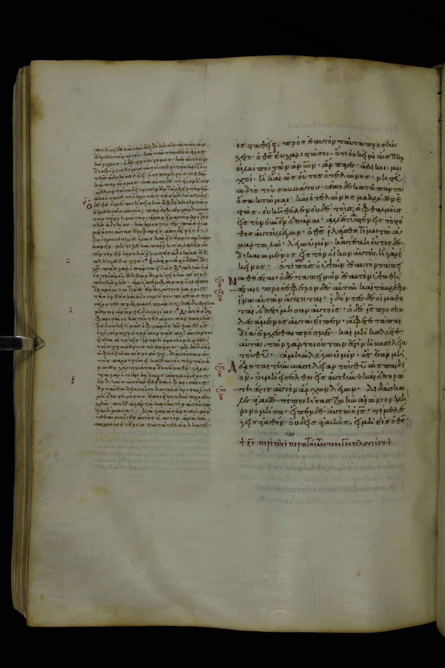 Tenth century minuscule of the Gospels with commentary; 285 leaves, 1 column, 4-34 lines per column. Images were taken at the National Library of Greece in Athens.