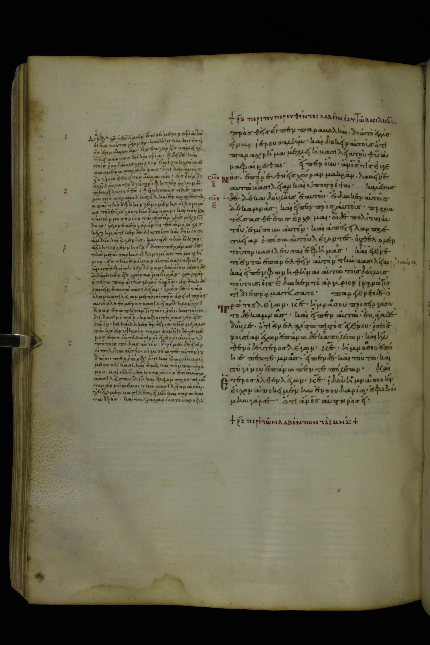 Tenth century minuscule of the Gospels with commentary; 285 leaves, 1 column, 4-34 lines per column. Images were taken at the National Library of Greece in Athens.