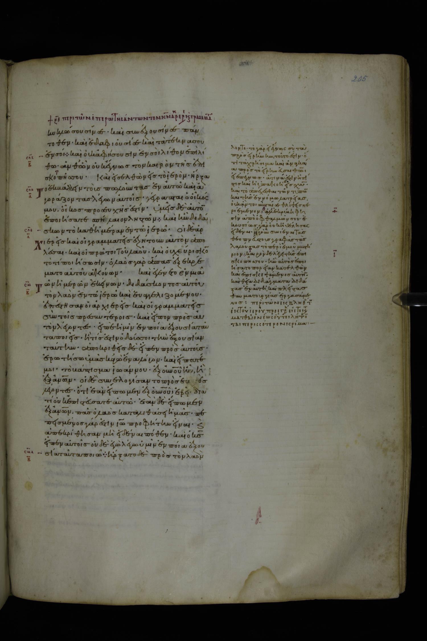 Tenth century minuscule of the Gospels with commentary; 285 leaves, 1 column, 4-34 lines per column. Images were taken at the National Library of Greece in Athens.