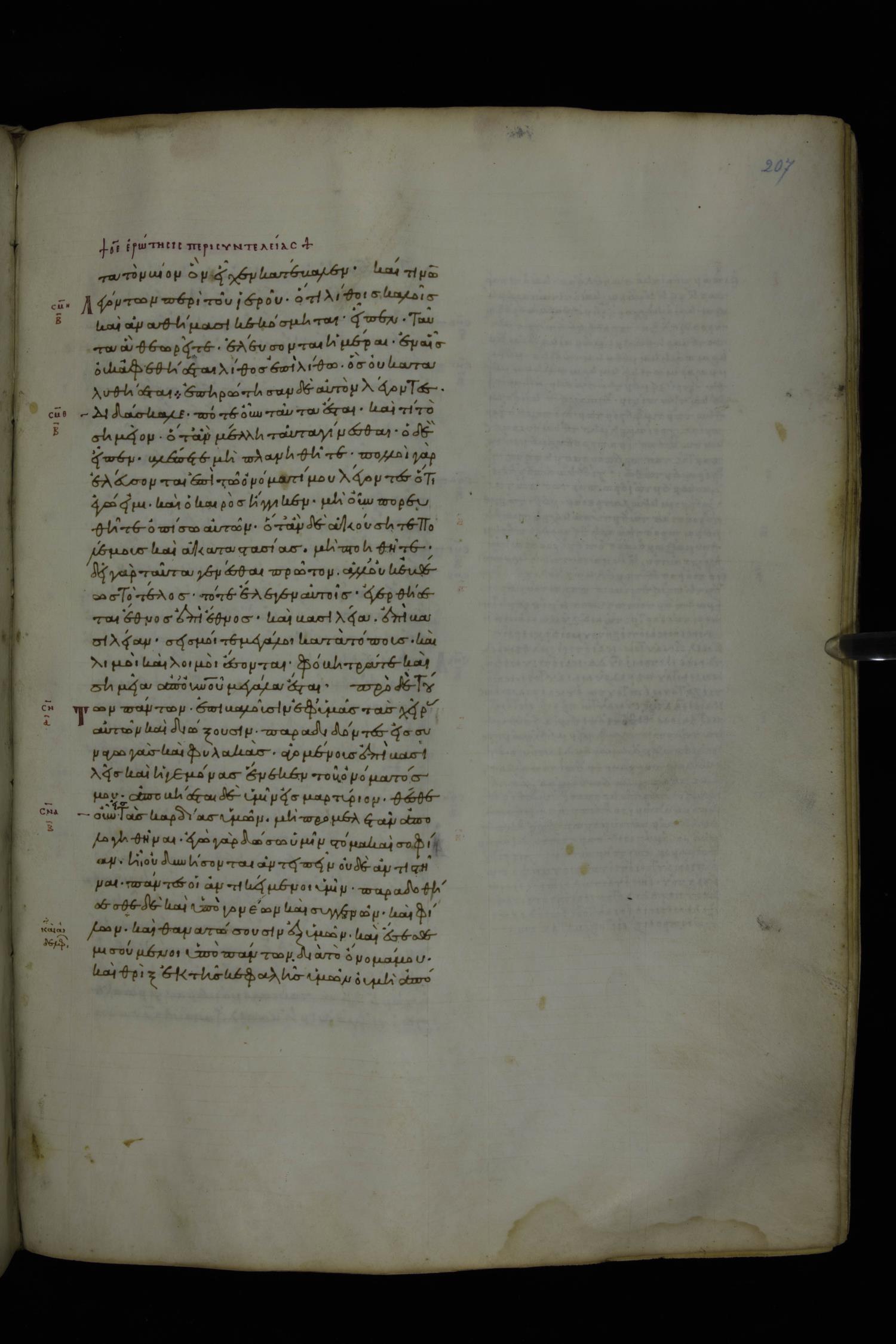 Tenth century minuscule of the Gospels with commentary; 285 leaves, 1 column, 4-34 lines per column. Images were taken at the National Library of Greece in Athens.