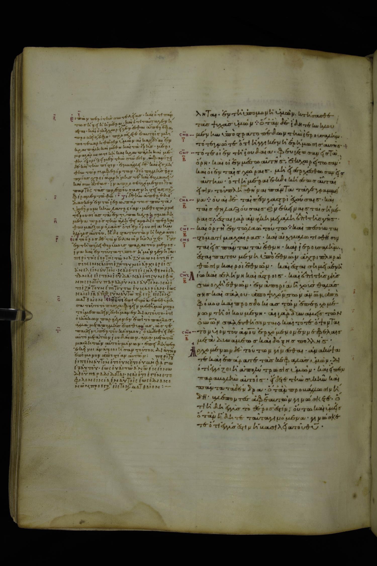 Tenth century minuscule of the Gospels with commentary; 285 leaves, 1 column, 4-34 lines per column. Images were taken at the National Library of Greece in Athens.