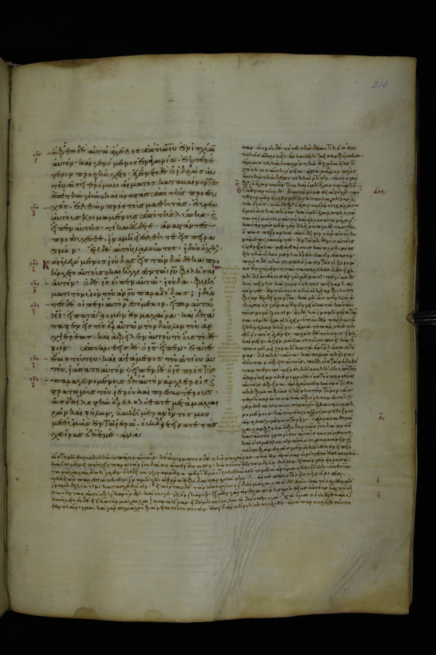 Tenth century minuscule of the Gospels with commentary; 285 leaves, 1 column, 4-34 lines per column. Images were taken at the National Library of Greece in Athens.
