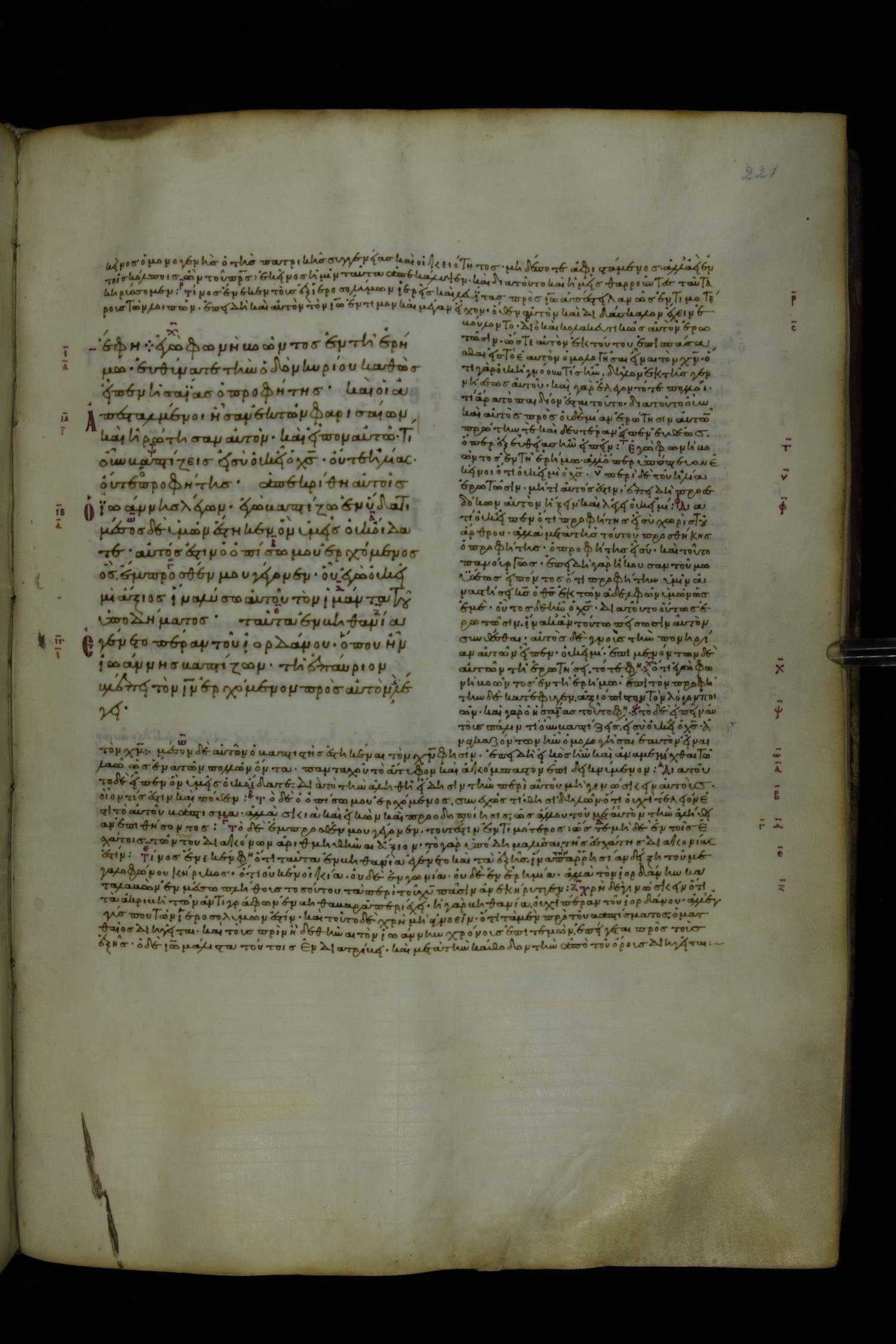 Tenth century minuscule of the Gospels with commentary; 285 leaves, 1 column, 4-34 lines per column. Images were taken at the National Library of Greece in Athens.
