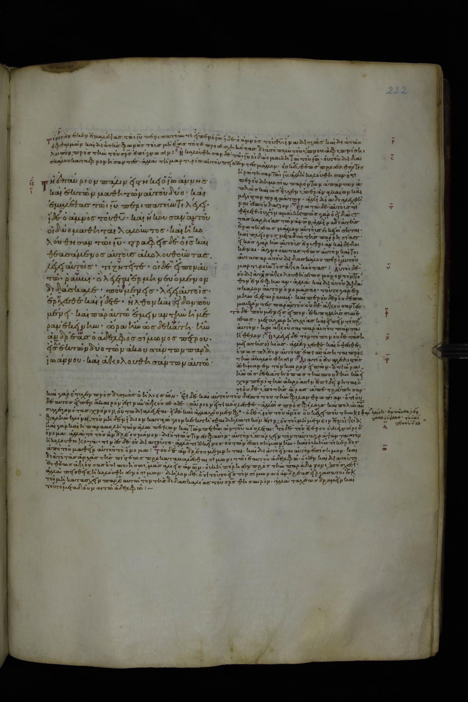 Tenth century minuscule of the Gospels with commentary; 285 leaves, 1 column, 4-34 lines per column. Images were taken at the National Library of Greece in Athens.