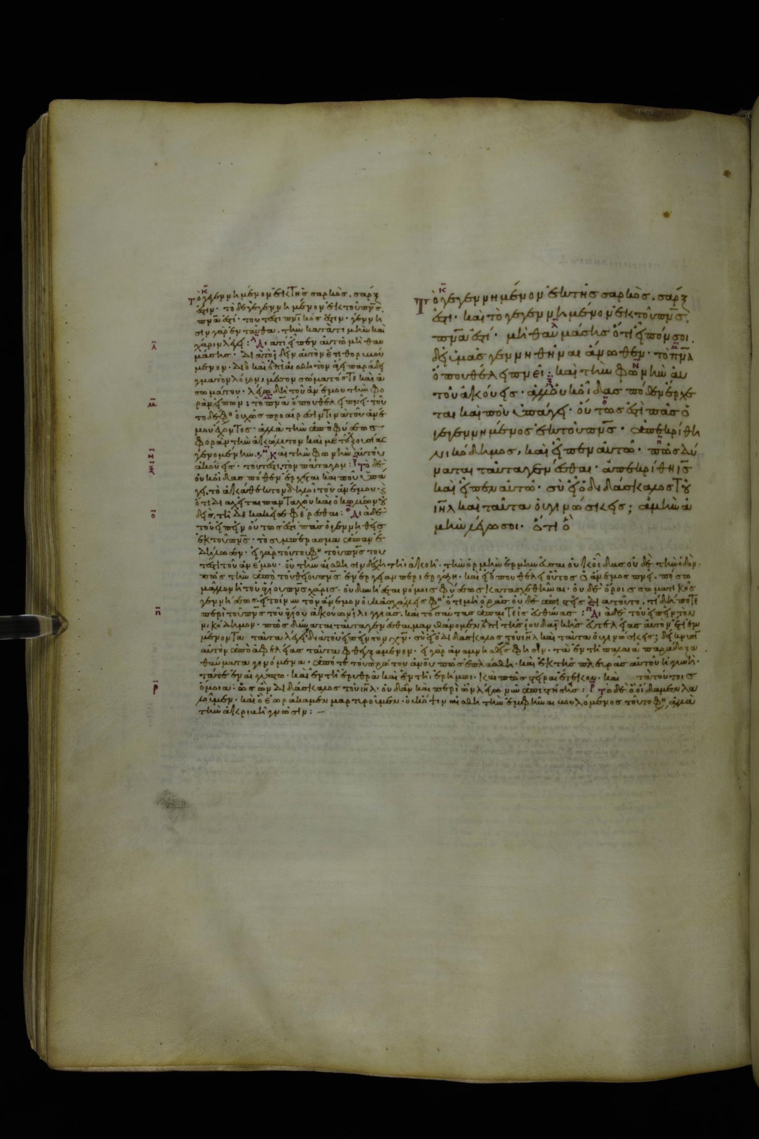 Tenth century minuscule of the Gospels with commentary; 285 leaves, 1 column, 4-34 lines per column. Images were taken at the National Library of Greece in Athens.