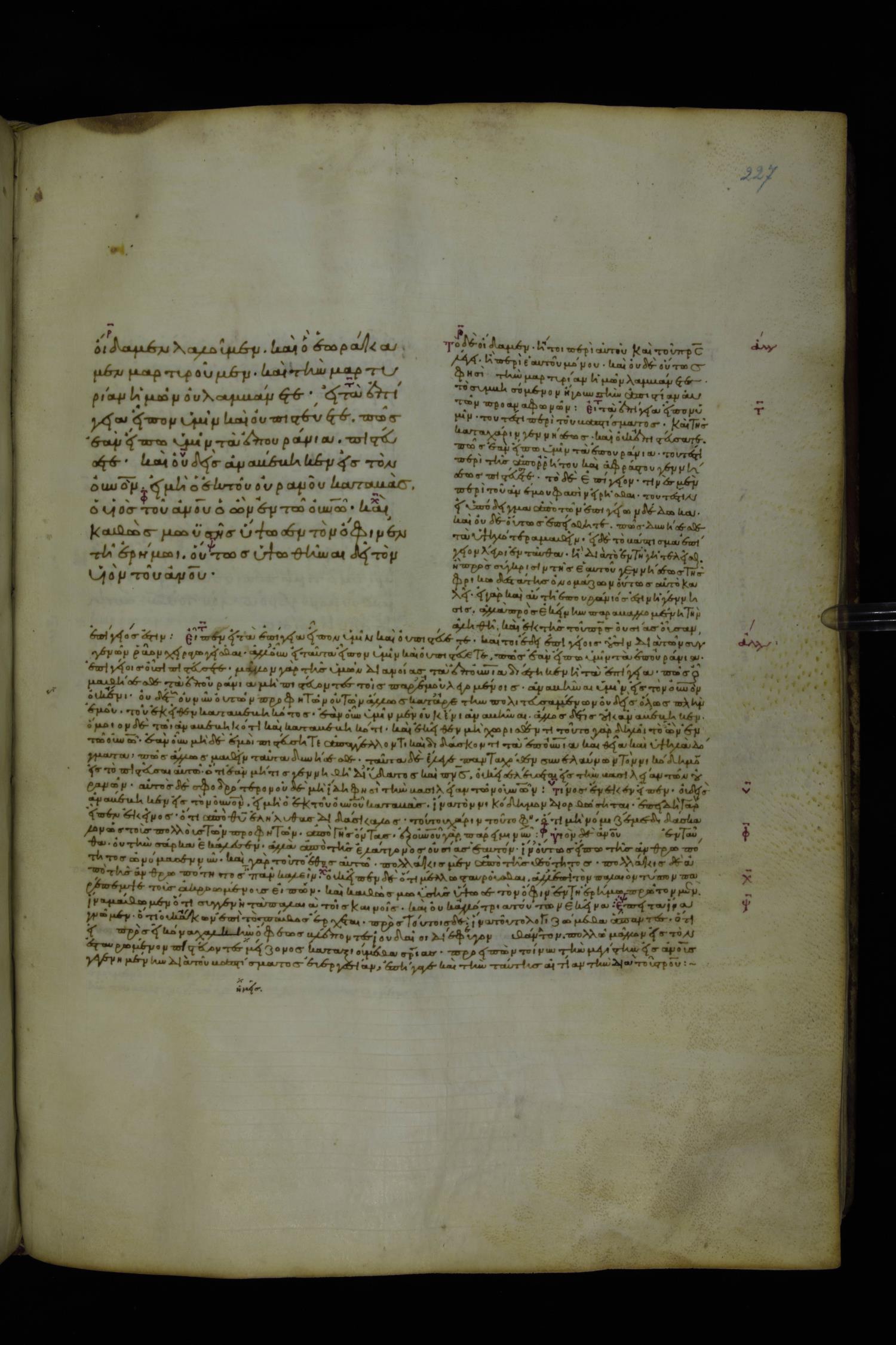 Tenth century minuscule of the Gospels with commentary; 285 leaves, 1 column, 4-34 lines per column. Images were taken at the National Library of Greece in Athens.