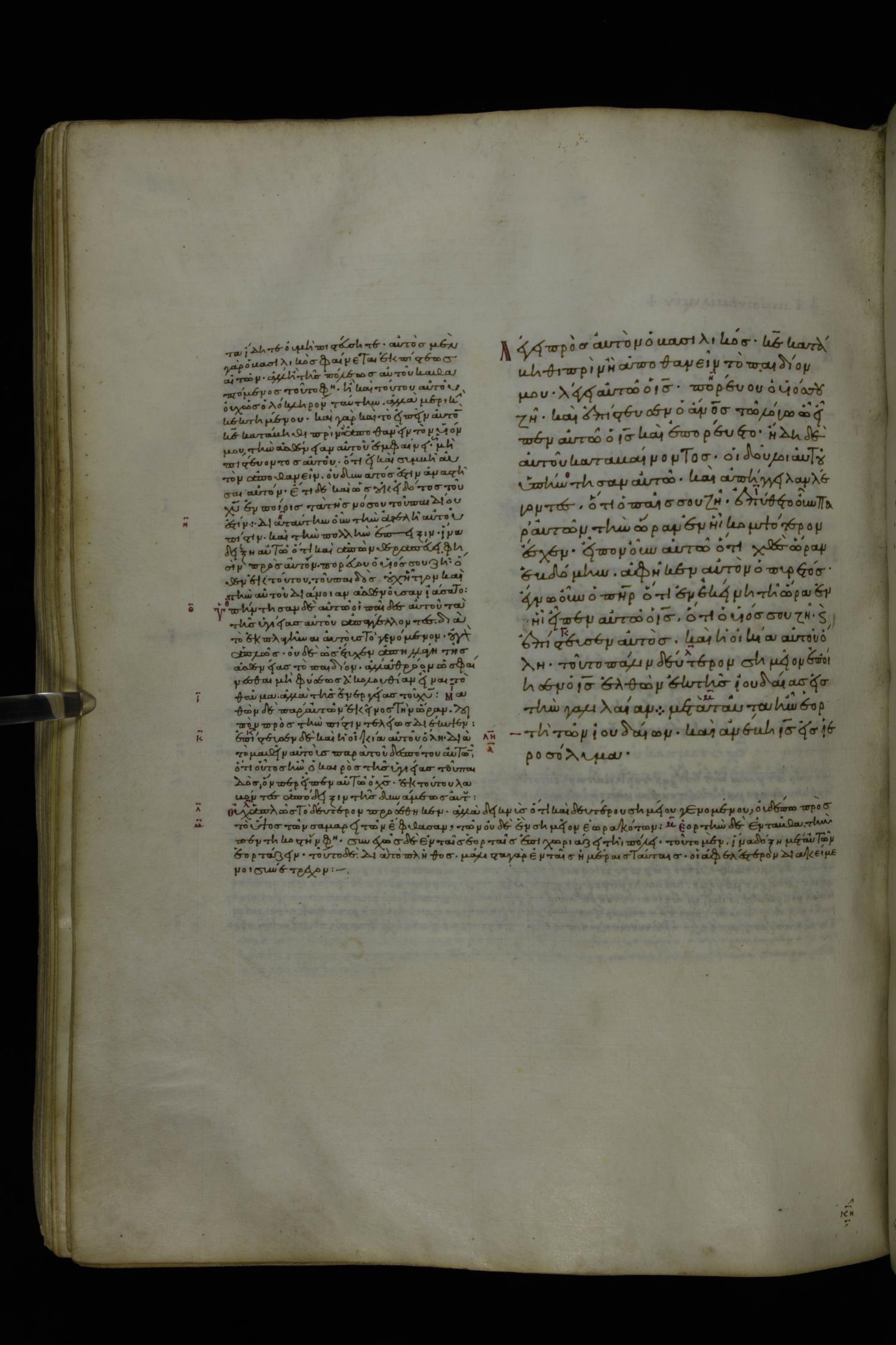 Tenth century minuscule of the Gospels with commentary; 285 leaves, 1 column, 4-34 lines per column. Images were taken at the National Library of Greece in Athens.