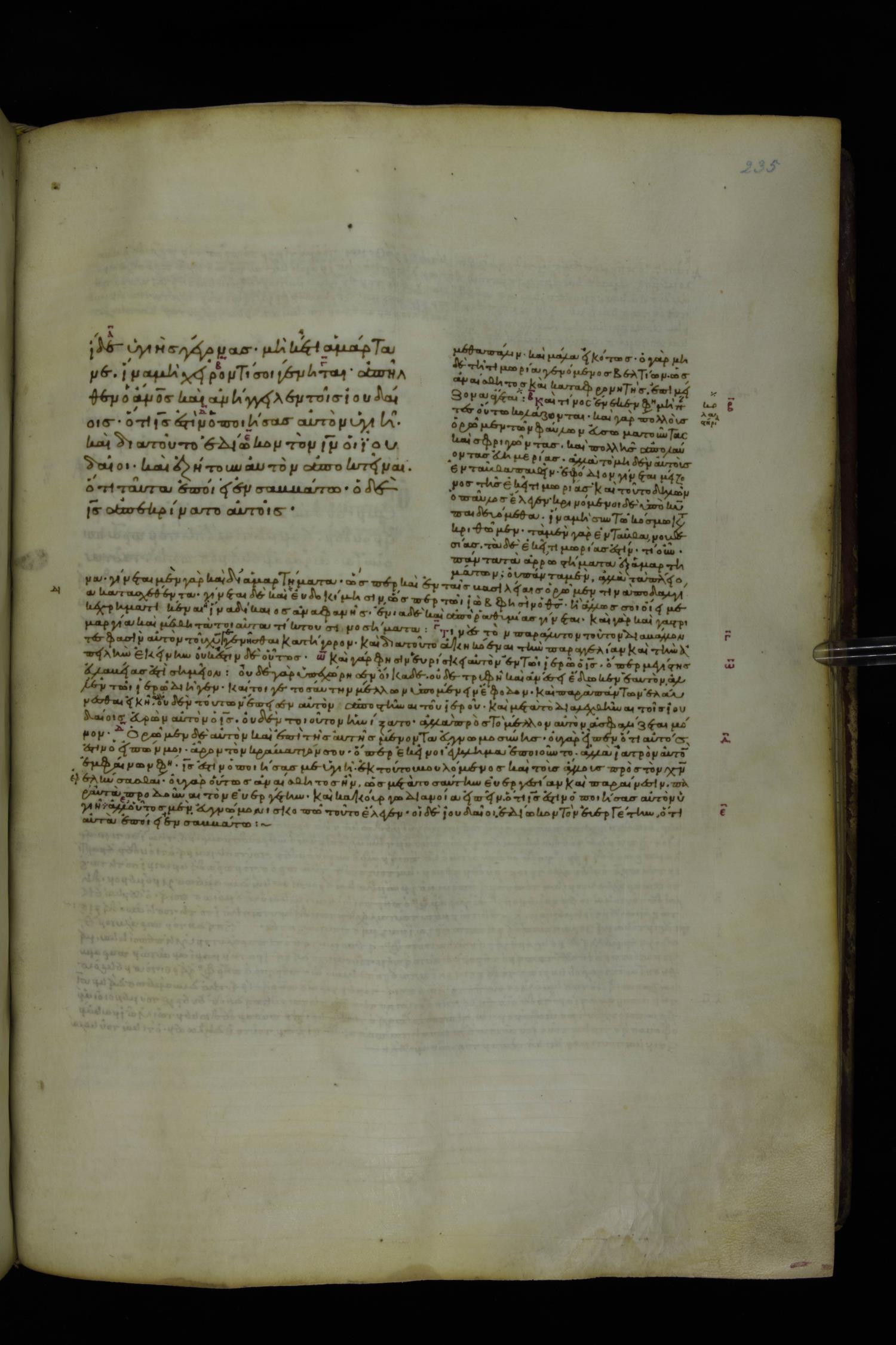 Tenth century minuscule of the Gospels with commentary; 285 leaves, 1 column, 4-34 lines per column. Images were taken at the National Library of Greece in Athens.