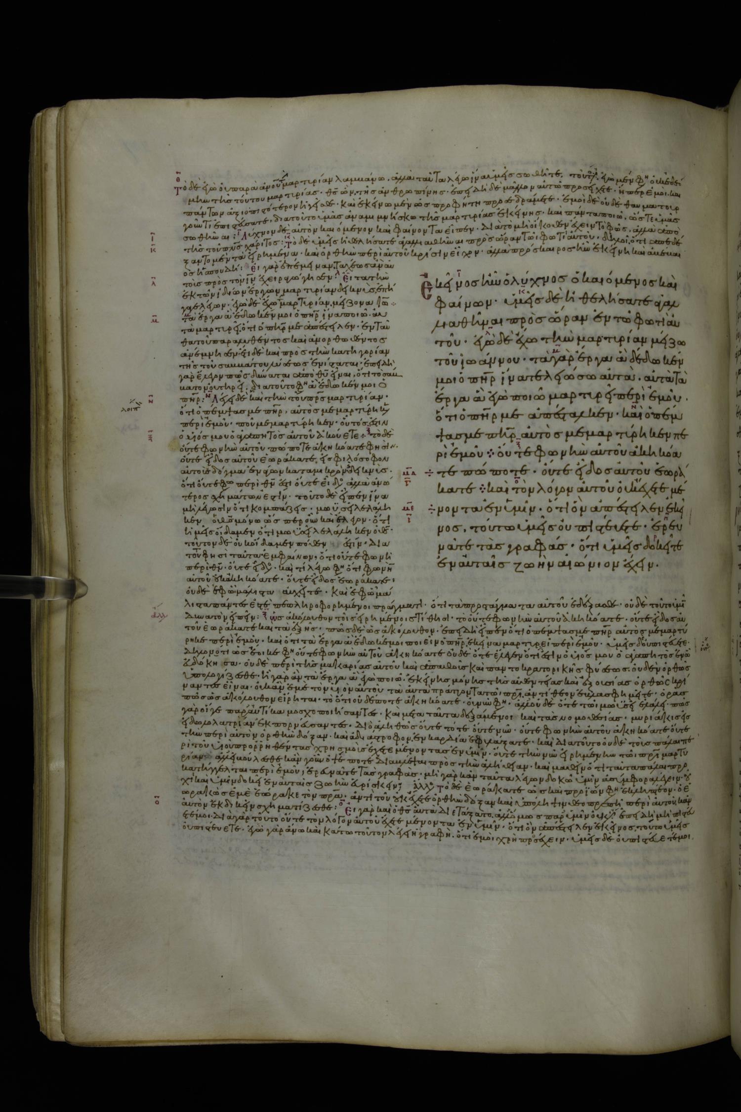 Tenth century minuscule of the Gospels with commentary; 285 leaves, 1 column, 4-34 lines per column. Images were taken at the National Library of Greece in Athens.