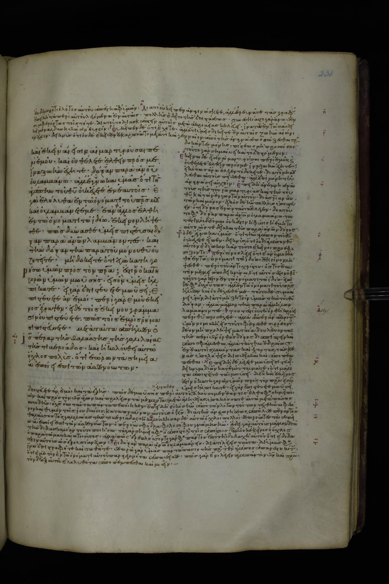 Tenth century minuscule of the Gospels with commentary; 285 leaves, 1 column, 4-34 lines per column. Images were taken at the National Library of Greece in Athens.