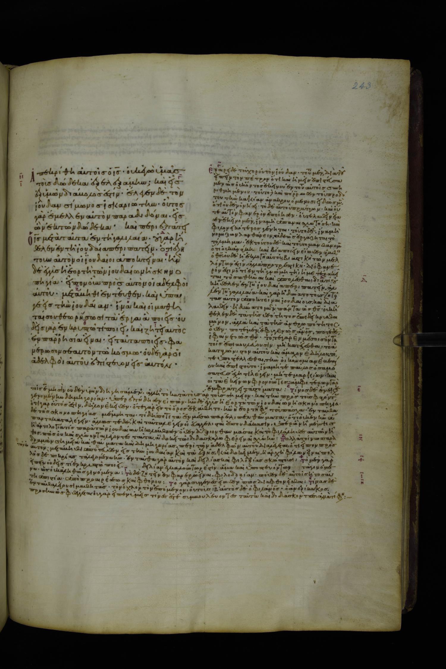 Tenth century minuscule of the Gospels with commentary; 285 leaves, 1 column, 4-34 lines per column. Images were taken at the National Library of Greece in Athens.