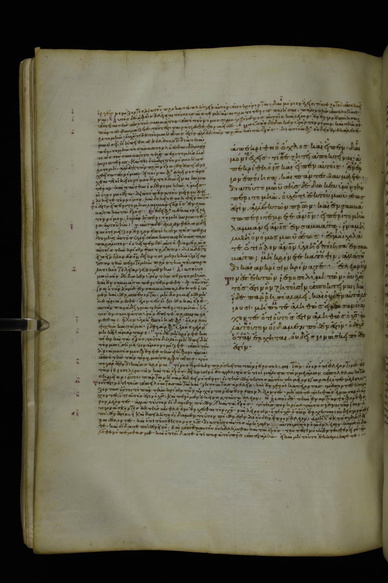 Tenth century minuscule of the Gospels with commentary; 285 leaves, 1 column, 4-34 lines per column. Images were taken at the National Library of Greece in Athens.