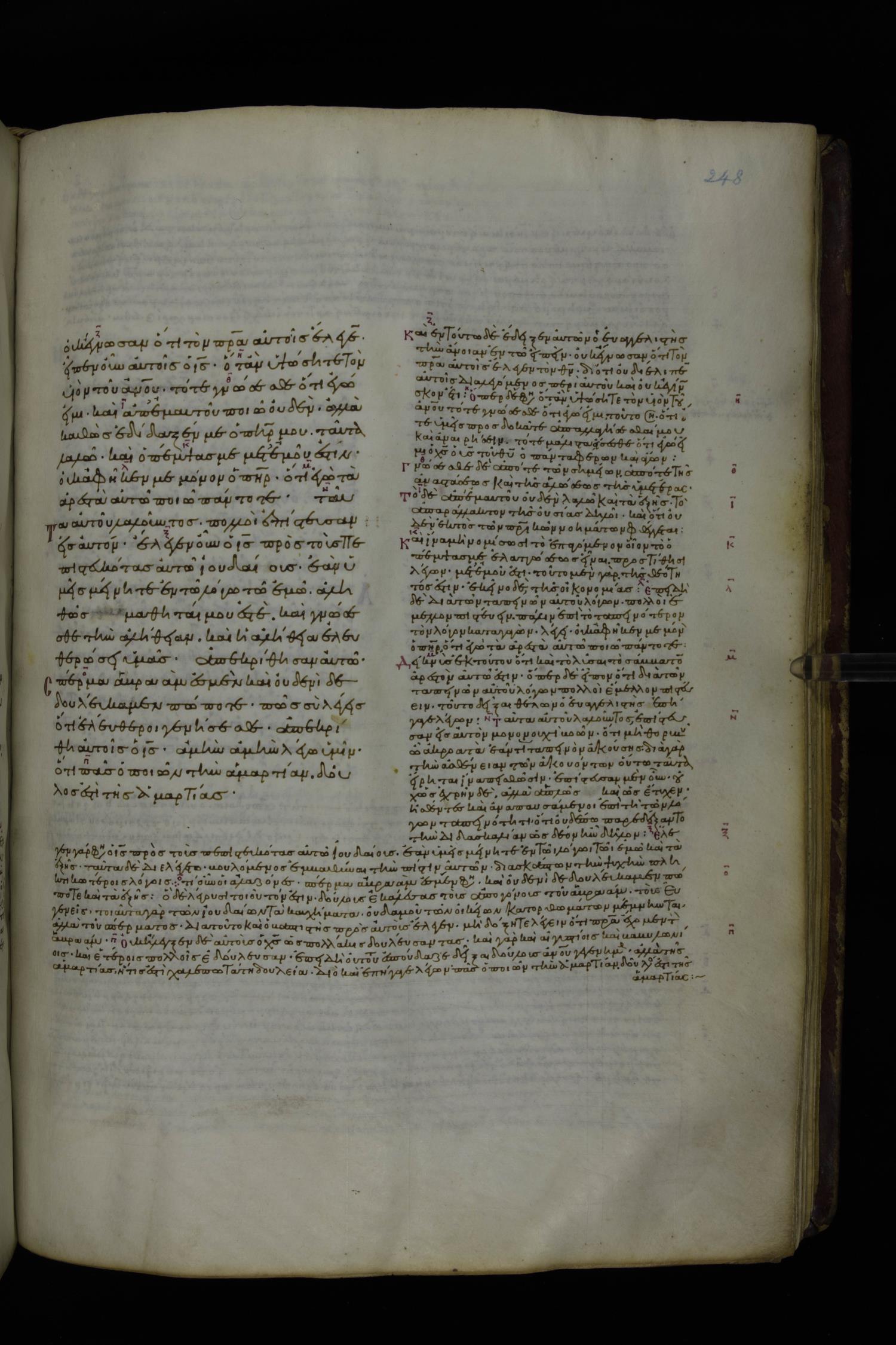 Tenth century minuscule of the Gospels with commentary; 285 leaves, 1 column, 4-34 lines per column. Images were taken at the National Library of Greece in Athens.