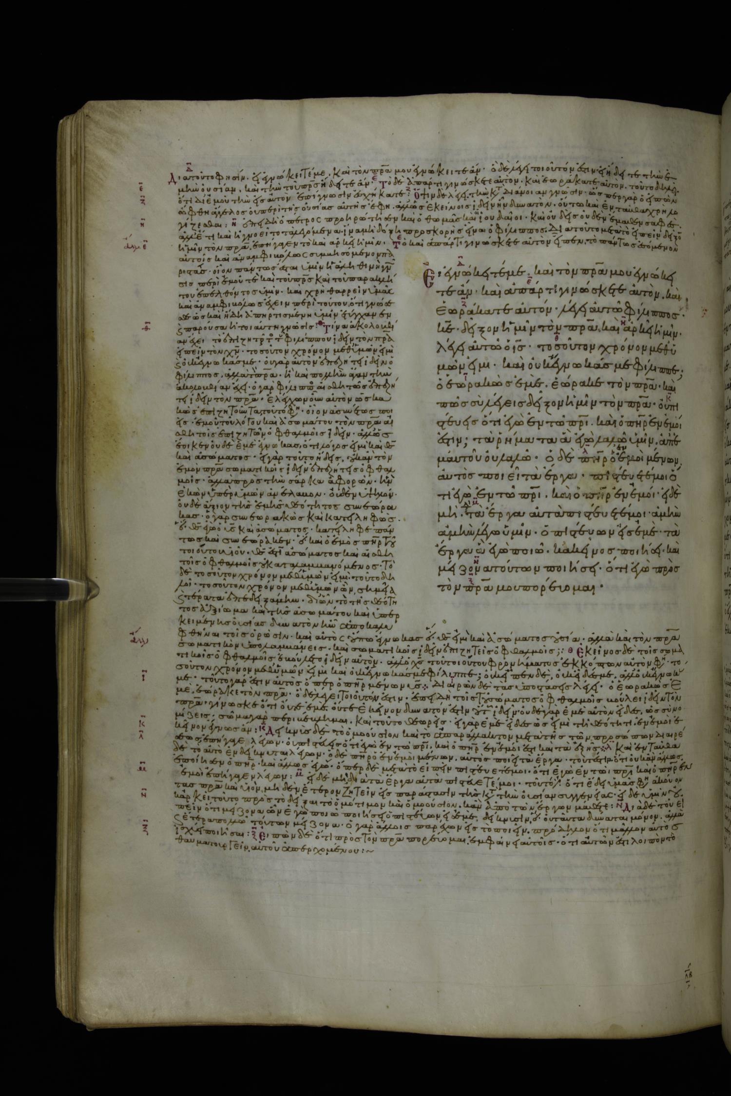Tenth century minuscule of the Gospels with commentary; 285 leaves, 1 column, 4-34 lines per column. Images were taken at the National Library of Greece in Athens.