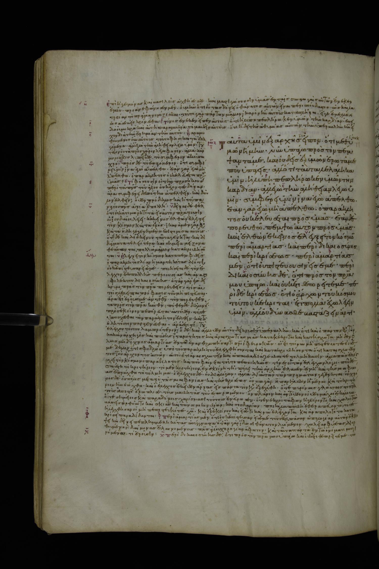 Tenth century minuscule of the Gospels with commentary; 285 leaves, 1 column, 4-34 lines per column. Images were taken at the National Library of Greece in Athens.