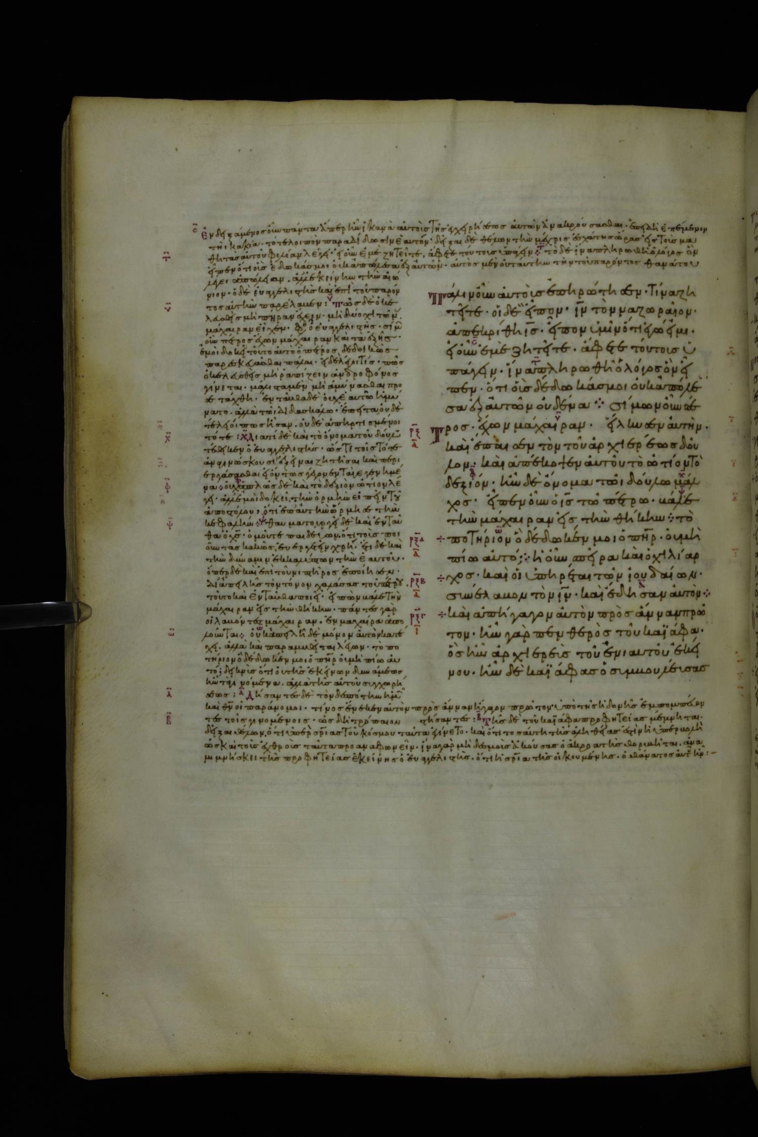 Tenth century minuscule of the Gospels with commentary; 285 leaves, 1 column, 4-34 lines per column. Images were taken at the National Library of Greece in Athens.