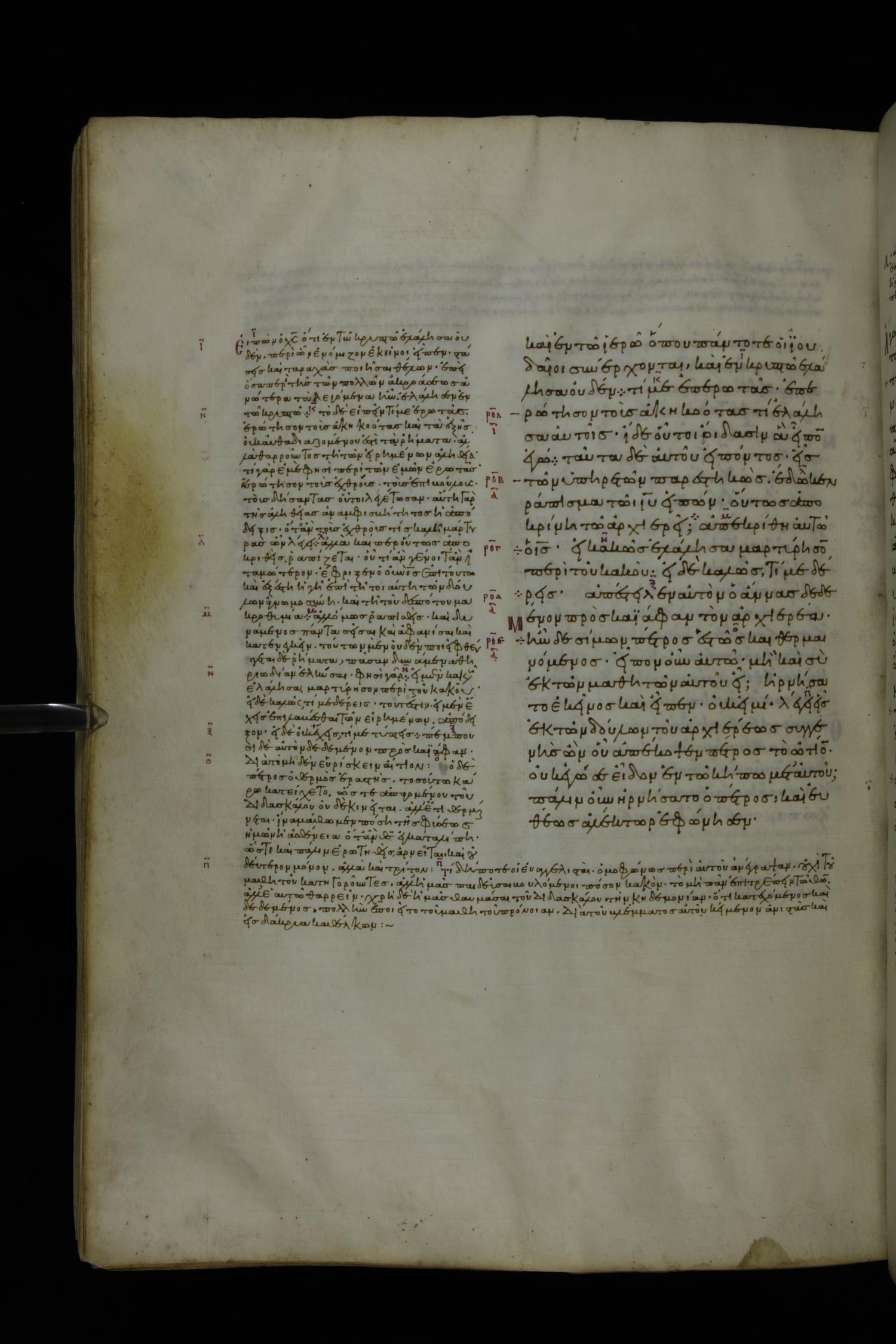 Tenth century minuscule of the Gospels with commentary; 285 leaves, 1 column, 4-34 lines per column. Images were taken at the National Library of Greece in Athens.