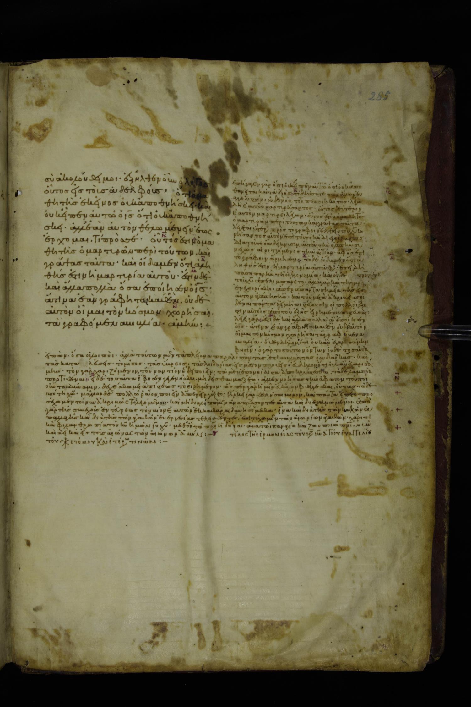 Tenth century minuscule of the Gospels with commentary; 285 leaves, 1 column, 4-34 lines per column. Images were taken at the National Library of Greece in Athens.