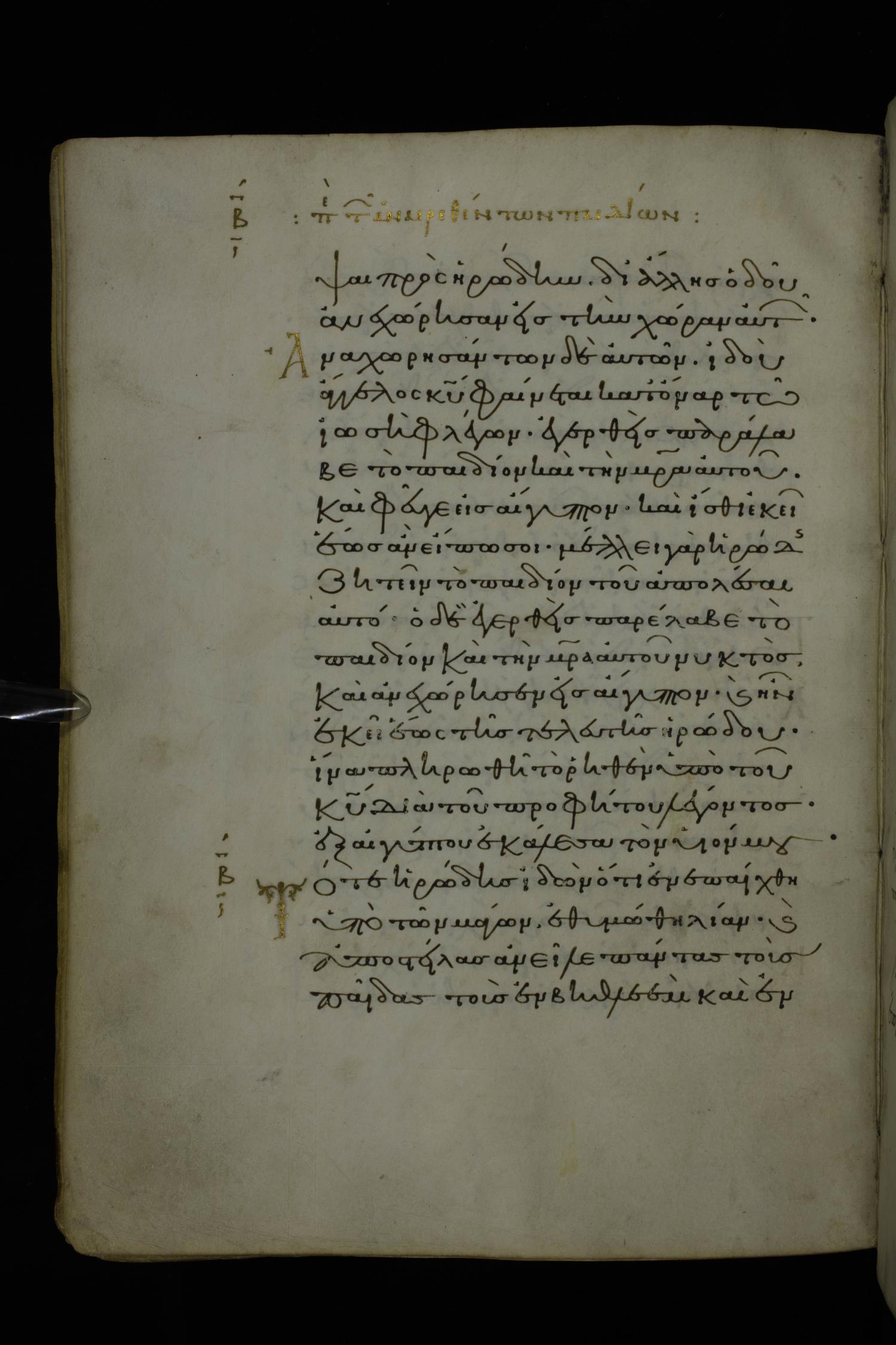 Eleventh century minuscule of Gospels on parchment; 370 leaves, 1 column, 20 lines per column. Images were taken at the National Library of Greece in Athens.