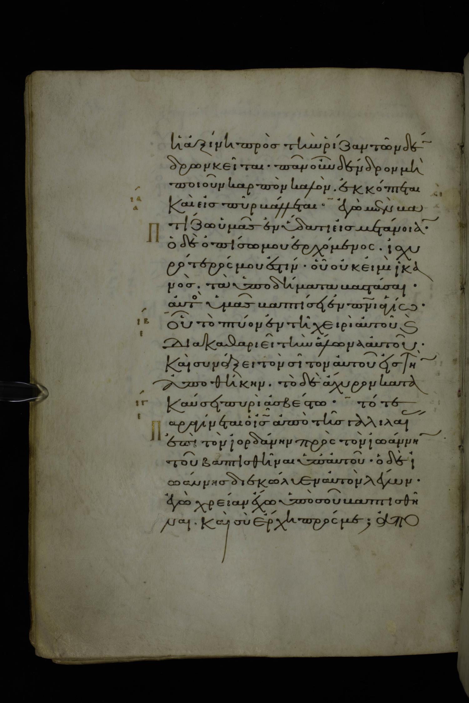 Eleventh century minuscule of Gospels on parchment; 370 leaves, 1 column, 20 lines per column. Images were taken at the National Library of Greece in Athens.
