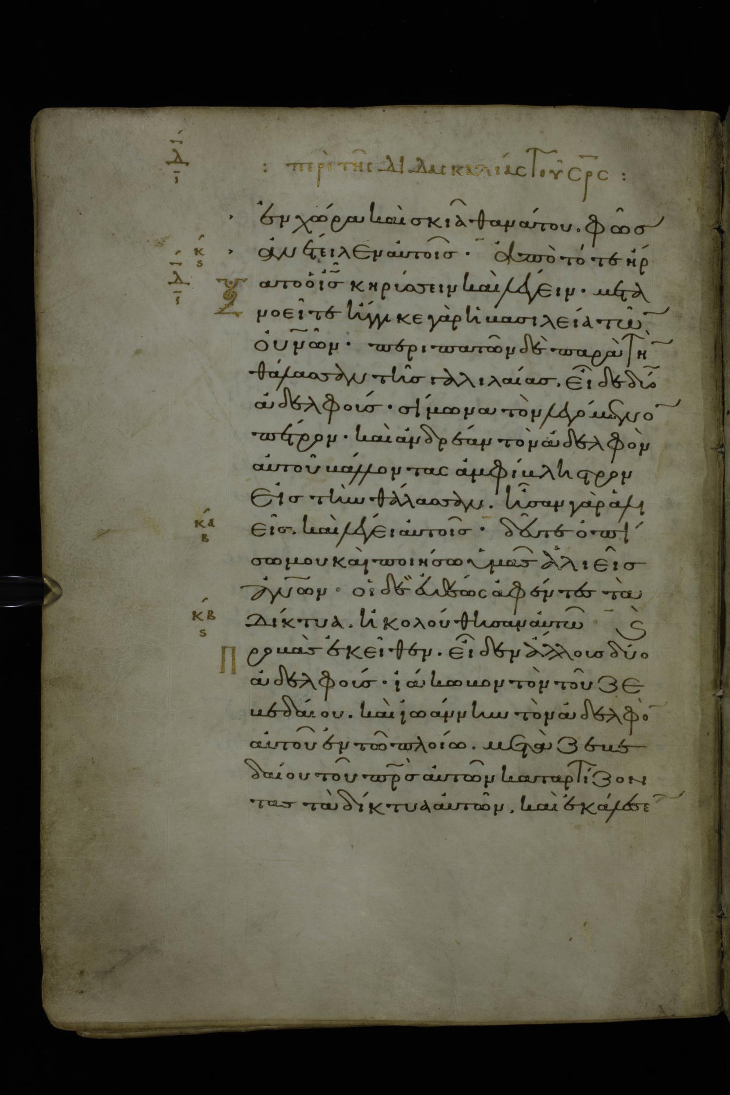 Eleventh century minuscule of Gospels on parchment; 370 leaves, 1 column, 20 lines per column. Images were taken at the National Library of Greece in Athens.