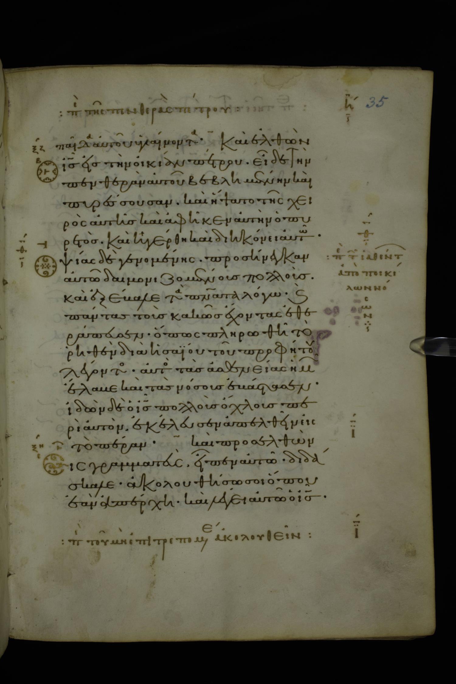 Eleventh century minuscule of Gospels on parchment; 370 leaves, 1 column, 20 lines per column. Images were taken at the National Library of Greece in Athens.