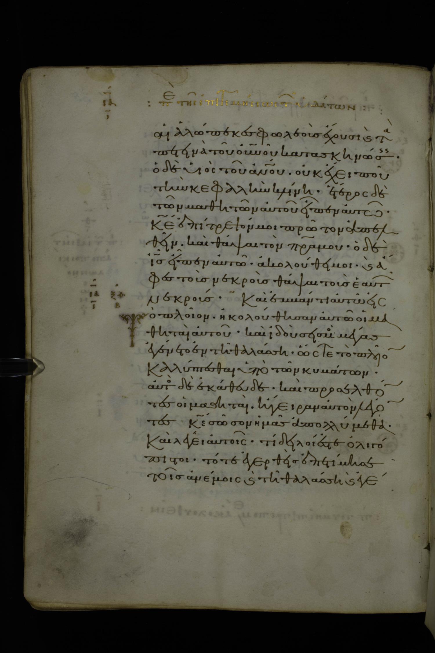 Eleventh century minuscule of Gospels on parchment; 370 leaves, 1 column, 20 lines per column. Images were taken at the National Library of Greece in Athens.