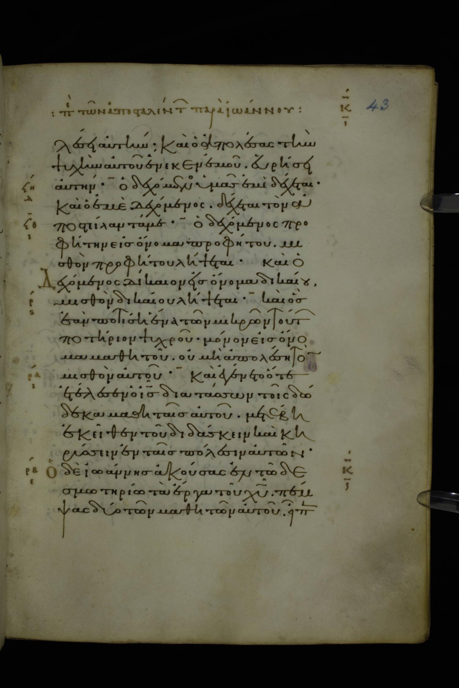 Eleventh century minuscule of Gospels on parchment; 370 leaves, 1 column, 20 lines per column. Images were taken at the National Library of Greece in Athens.