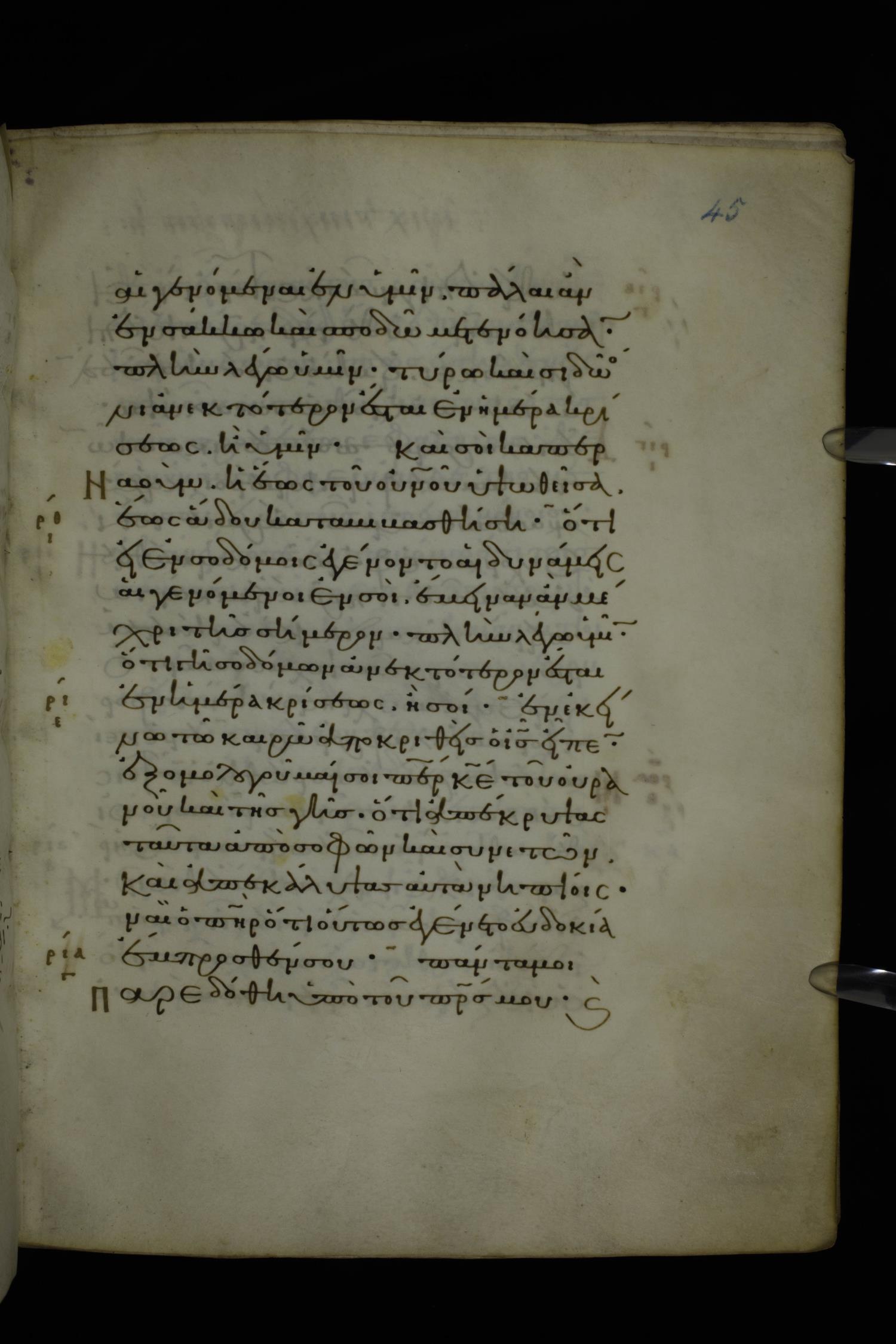 Eleventh century minuscule of Gospels on parchment; 370 leaves, 1 column, 20 lines per column. Images were taken at the National Library of Greece in Athens.