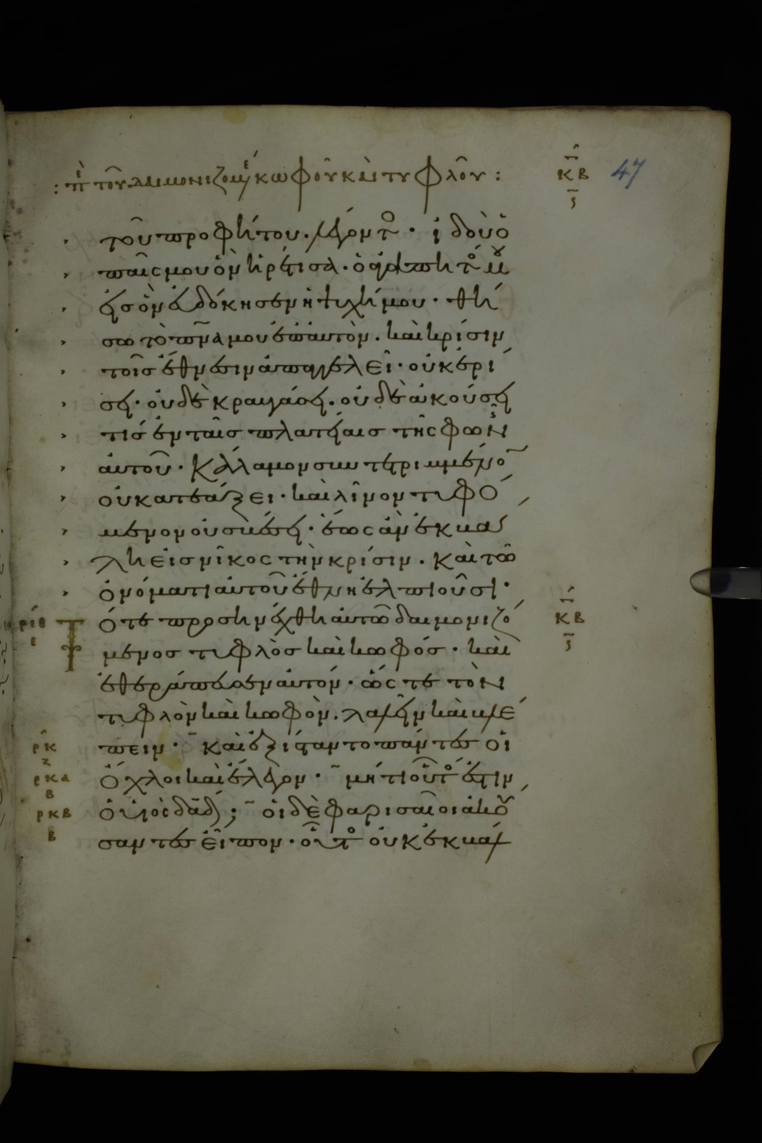Eleventh century minuscule of Gospels on parchment; 370 leaves, 1 column, 20 lines per column. Images were taken at the National Library of Greece in Athens.