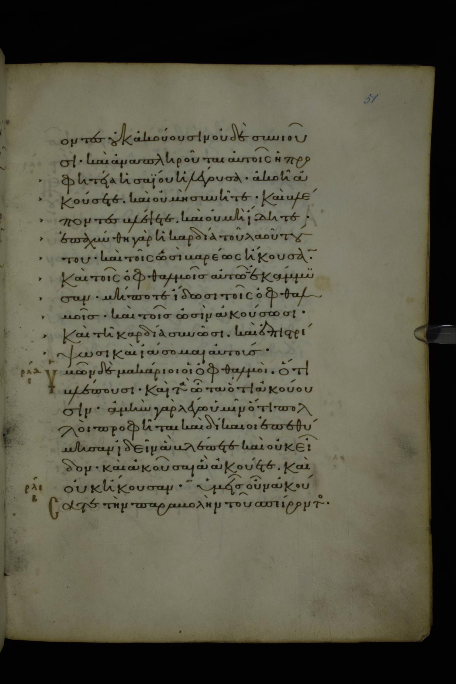 Eleventh century minuscule of Gospels on parchment; 370 leaves, 1 column, 20 lines per column. Images were taken at the National Library of Greece in Athens.