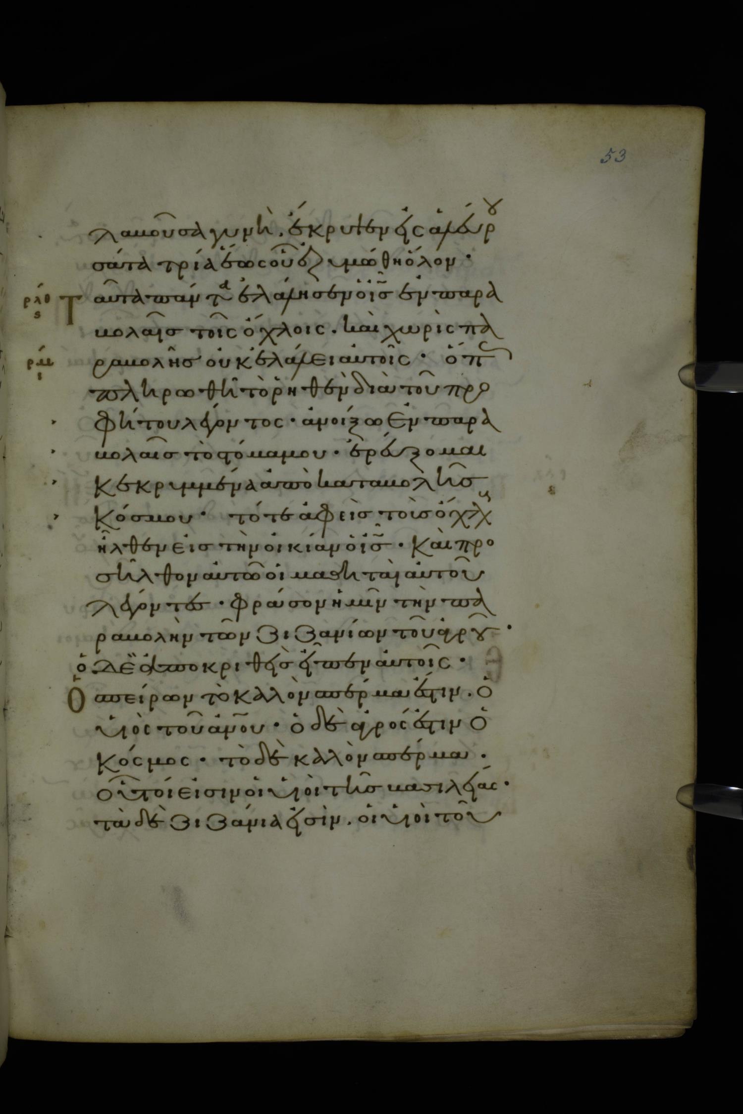 Eleventh century minuscule of Gospels on parchment; 370 leaves, 1 column, 20 lines per column. Images were taken at the National Library of Greece in Athens.