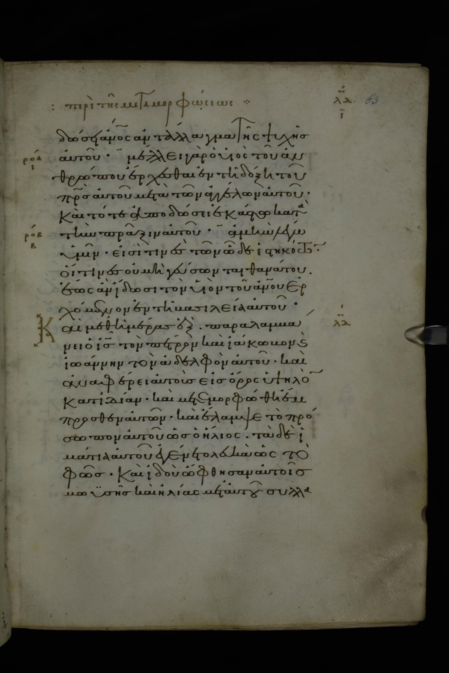 Eleventh century minuscule of Gospels on parchment; 370 leaves, 1 column, 20 lines per column. Images were taken at the National Library of Greece in Athens.