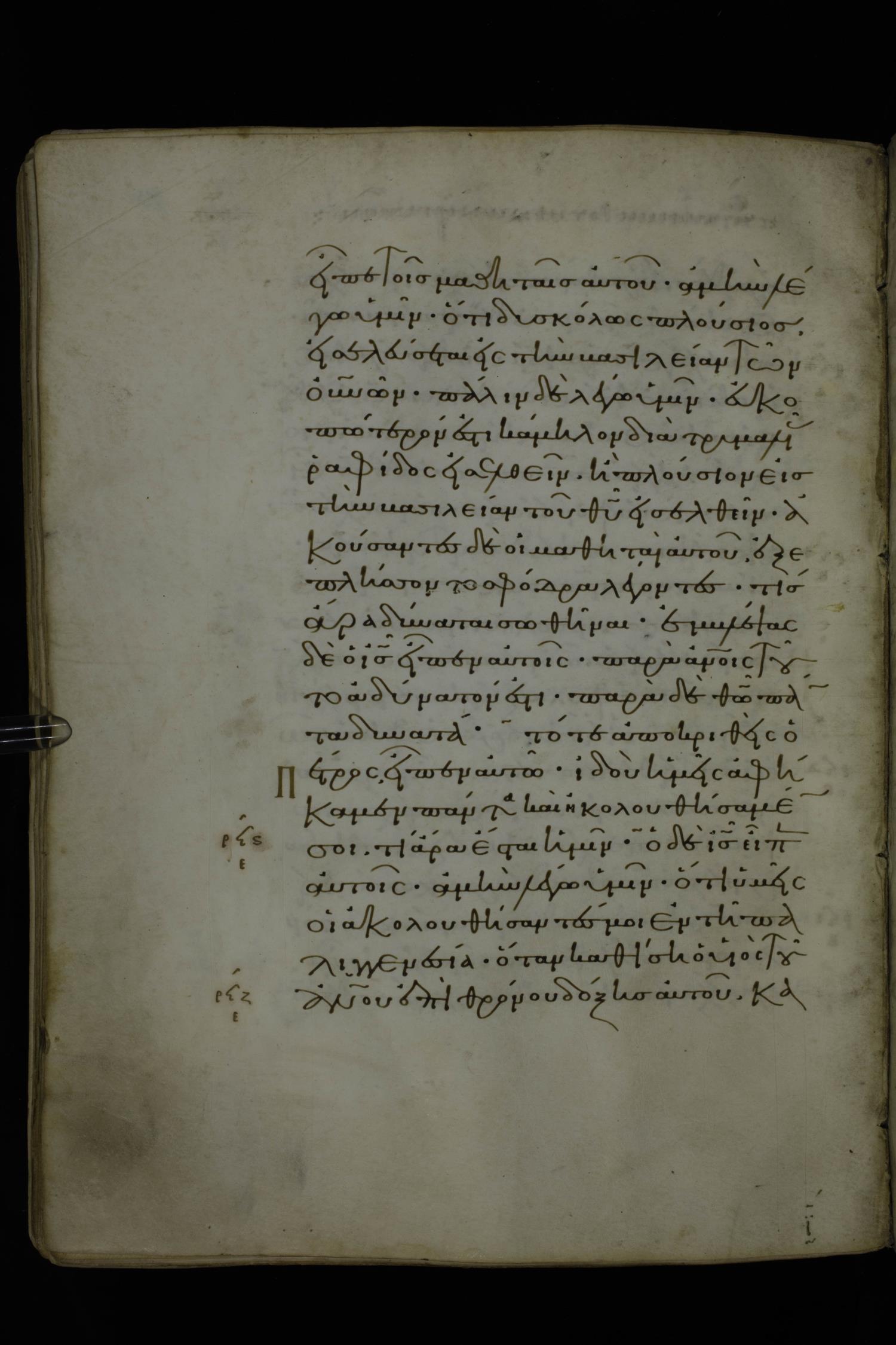 Eleventh century minuscule of Gospels on parchment; 370 leaves, 1 column, 20 lines per column. Images were taken at the National Library of Greece in Athens.