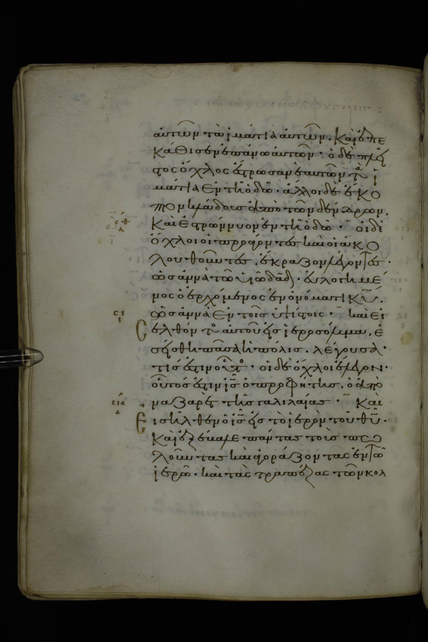 Eleventh century minuscule of Gospels on parchment; 370 leaves, 1 column, 20 lines per column. Images were taken at the National Library of Greece in Athens.