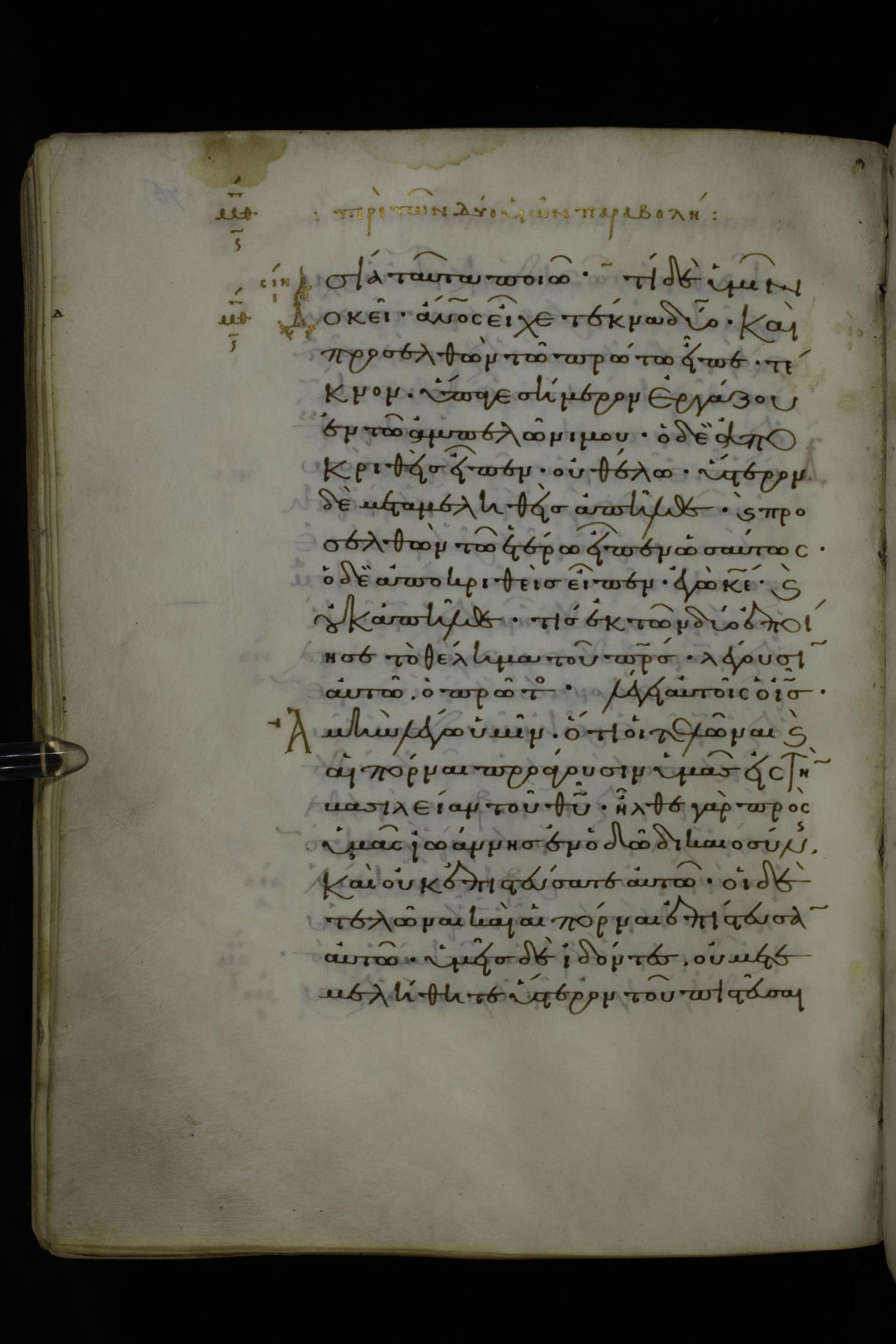 Eleventh century minuscule of Gospels on parchment; 370 leaves, 1 column, 20 lines per column. Images were taken at the National Library of Greece in Athens.