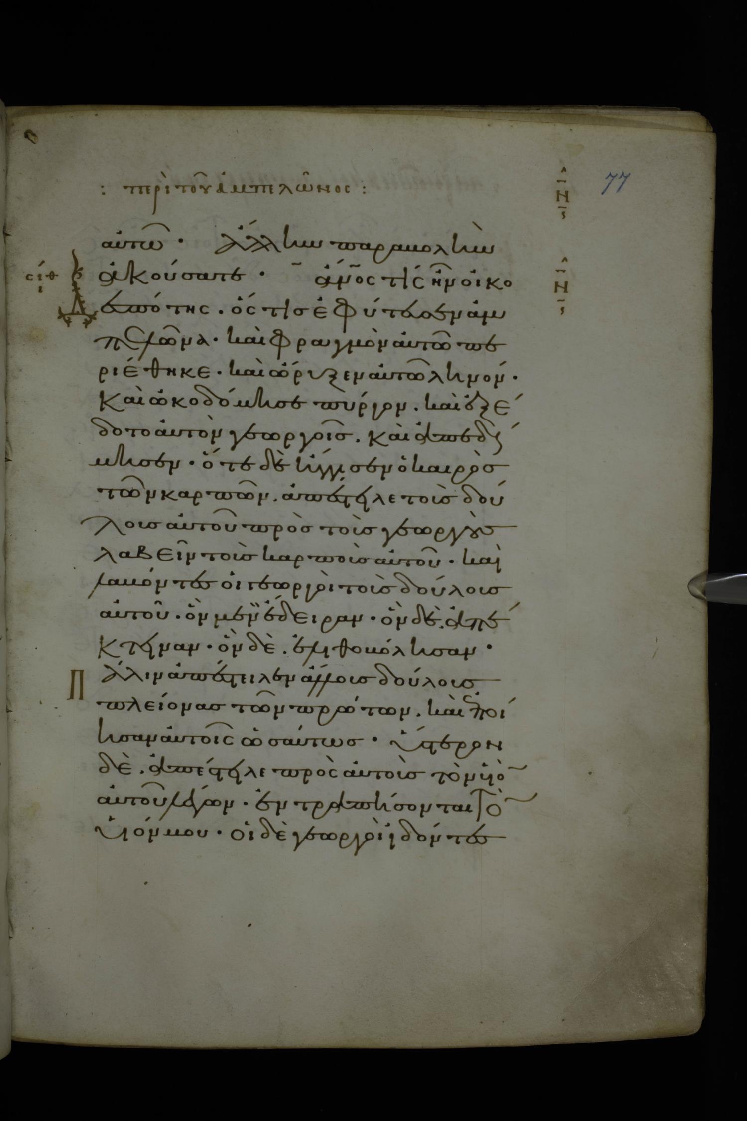 Eleventh century minuscule of Gospels on parchment; 370 leaves, 1 column, 20 lines per column. Images were taken at the National Library of Greece in Athens.