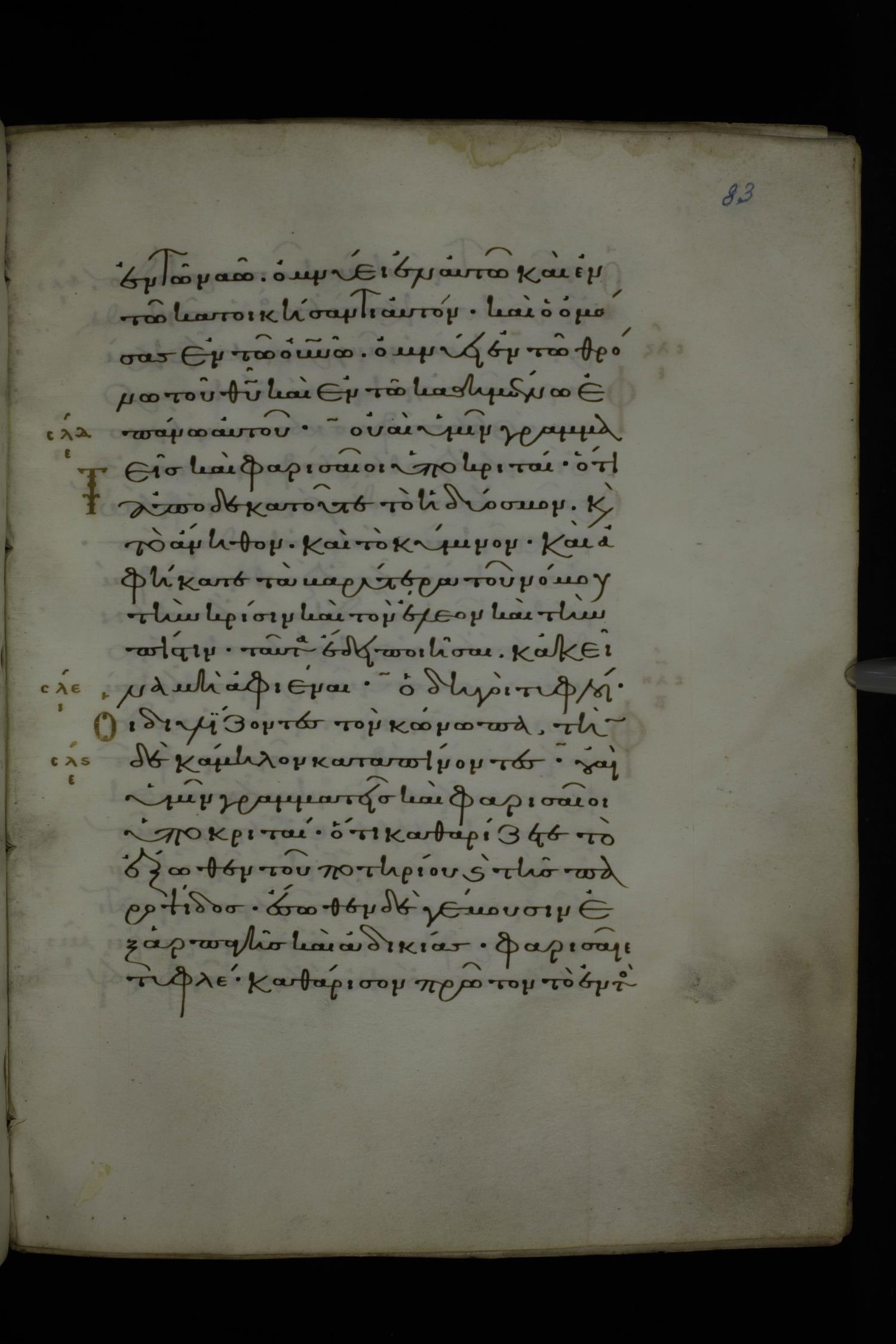 Eleventh century minuscule of Gospels on parchment; 370 leaves, 1 column, 20 lines per column. Images were taken at the National Library of Greece in Athens.