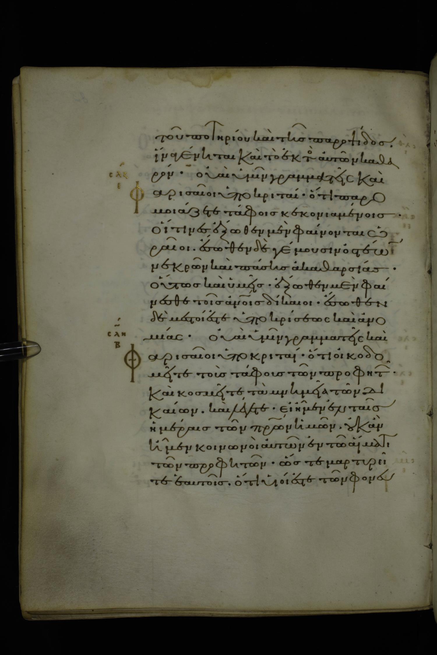 Eleventh century minuscule of Gospels on parchment; 370 leaves, 1 column, 20 lines per column. Images were taken at the National Library of Greece in Athens.
