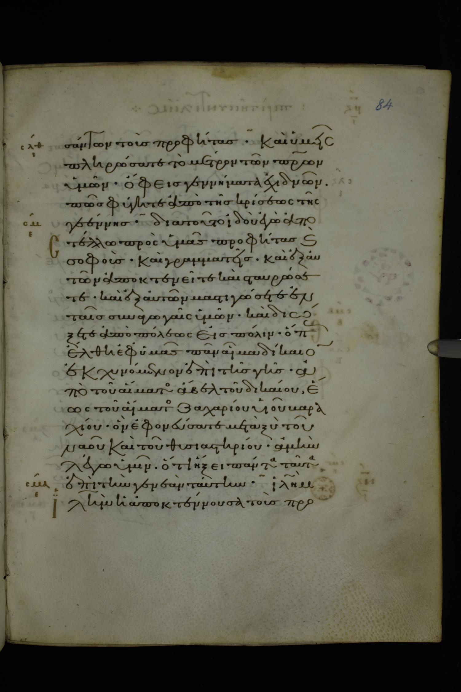 Eleventh century minuscule of Gospels on parchment; 370 leaves, 1 column, 20 lines per column. Images were taken at the National Library of Greece in Athens.