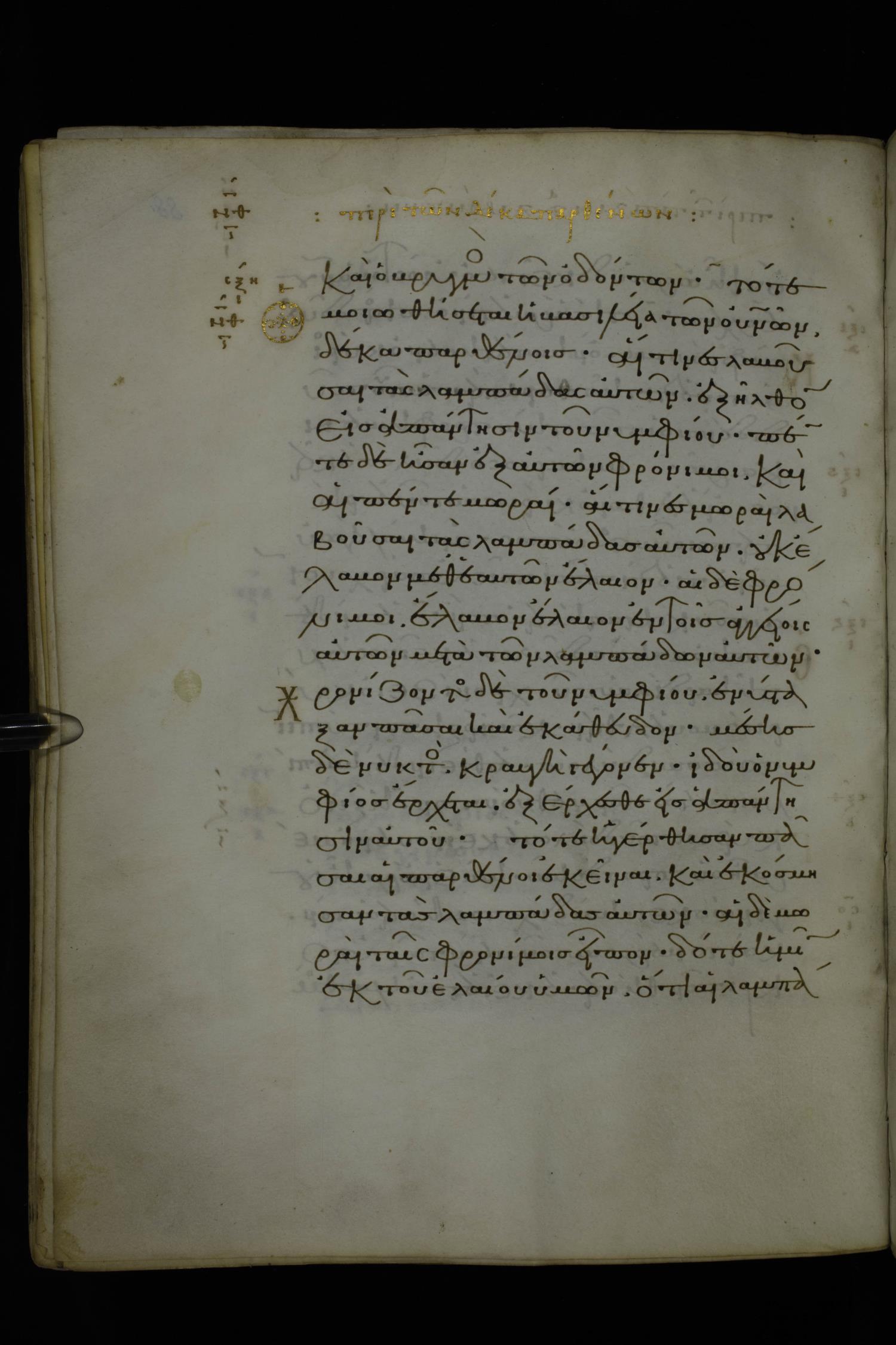 Eleventh century minuscule of Gospels on parchment; 370 leaves, 1 column, 20 lines per column. Images were taken at the National Library of Greece in Athens.