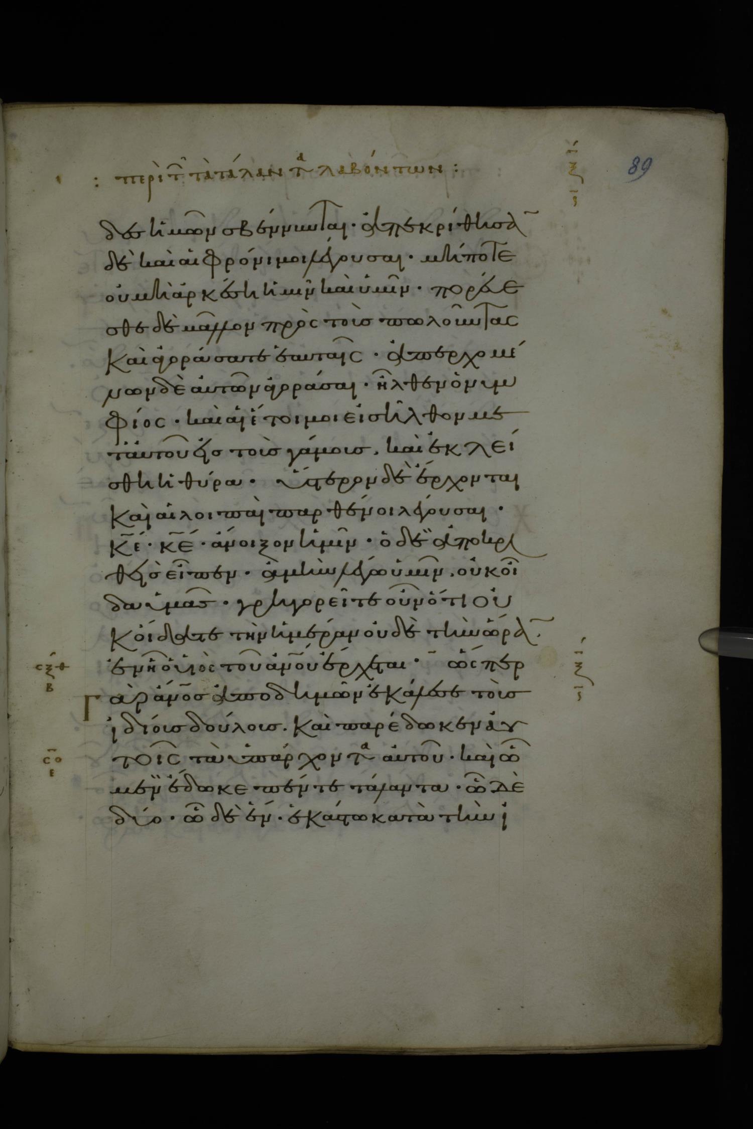 Eleventh century minuscule of Gospels on parchment; 370 leaves, 1 column, 20 lines per column. Images were taken at the National Library of Greece in Athens.
